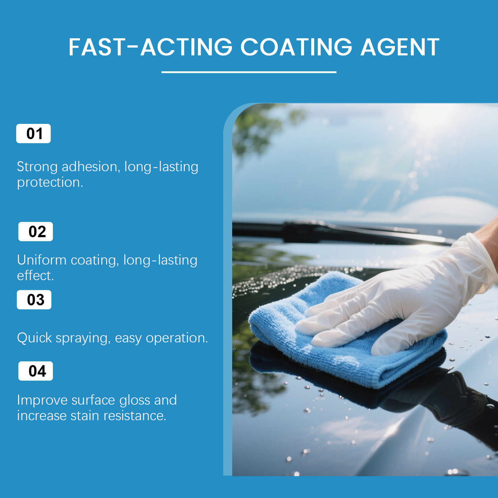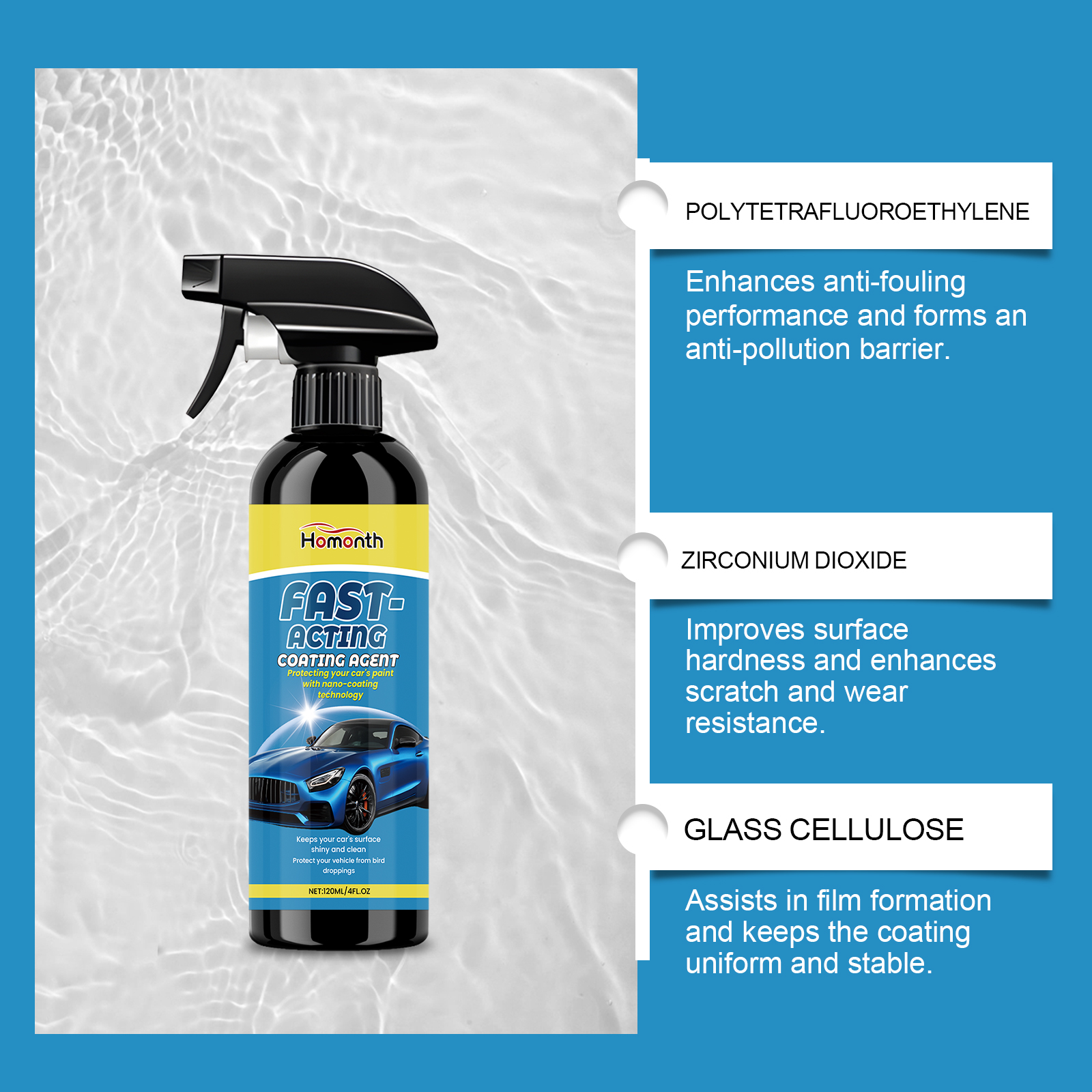 我们的汽车涂层喷雾套装,由去离子水、聚四氟乙烯精心调配而成。专为帮助提供汽车的光泽和保护,保持表面明亮和清洁,并使汽车看起来更加出色设计。使用方法极为便捷:1.用毛巾清洁汽车表面并擦干。2.将适量本产品均匀喷洒在车漆上。3.使用海绵来回擦拭,直到表面抛光。并且它使用纳米涂层技术可以减少表面污垢和碎屑的积累,并为车漆提供保护,它保护车表面免受鸟粪的影响,并帮助汽车保持光泽。
