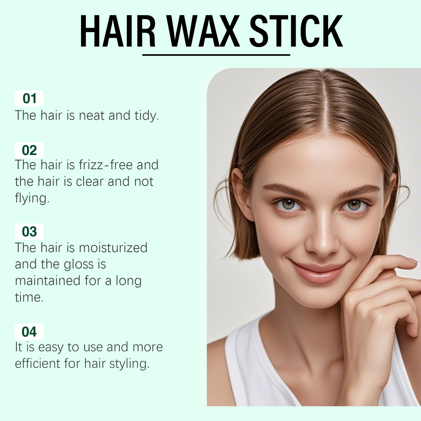 我们的滋润定型发蜡棒,由矿油、白蜂蜡、矿脂精心调配而成。专为温和滋养发丝,修复受损角质层,提升头发弹性与柔软触感,有助于形成透气保护膜,锁住头发水分防止干燥,维持整天清爽造型不扁塌设计。使用方法极为便捷:1.转动下方旋钮至有适量发蜡。2.将本品直接均匀涂抹在需要定型的头发上。3.用手指或梳子塑造出想要的头发造型即可。并且它蕴含滋养成分,深层润泽发丝改善干枯,令秀发呈现健康光泽不显油腻,独特质地轻盈易推开,快速定型同时抚平毛躁,打造持久柔顺造型不僵硬不结块。