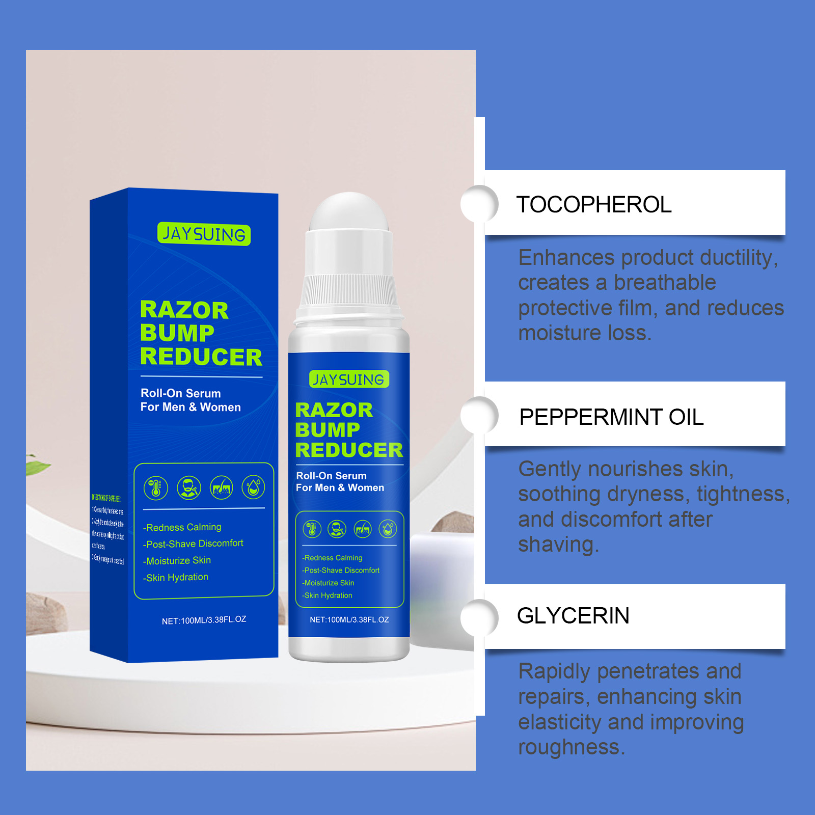 我们的剃须后滚珠精华,由生育酚(维生素E)、薄荷油精心调配而成。专为快速缓解剃须后的灼热和刺痛感设计。使用方法极为便捷:1.清洁并擦干剃须区域。2.将产品均匀地涂抹在剃须区域,通过滚动产品来完成。3.轻轻按摩直至吸收。并且可以增强皮肤的防御力并减少外部刺激物的影响。