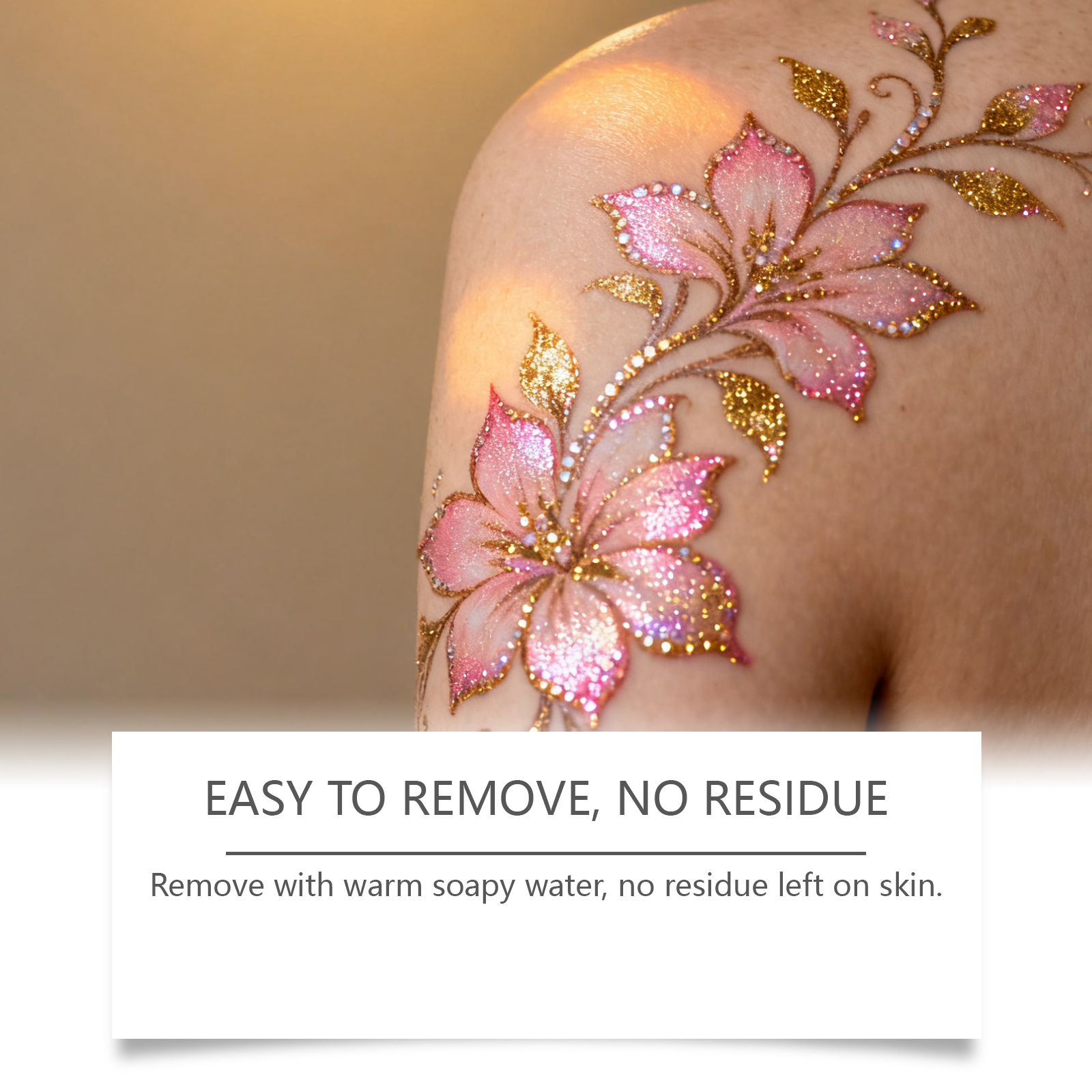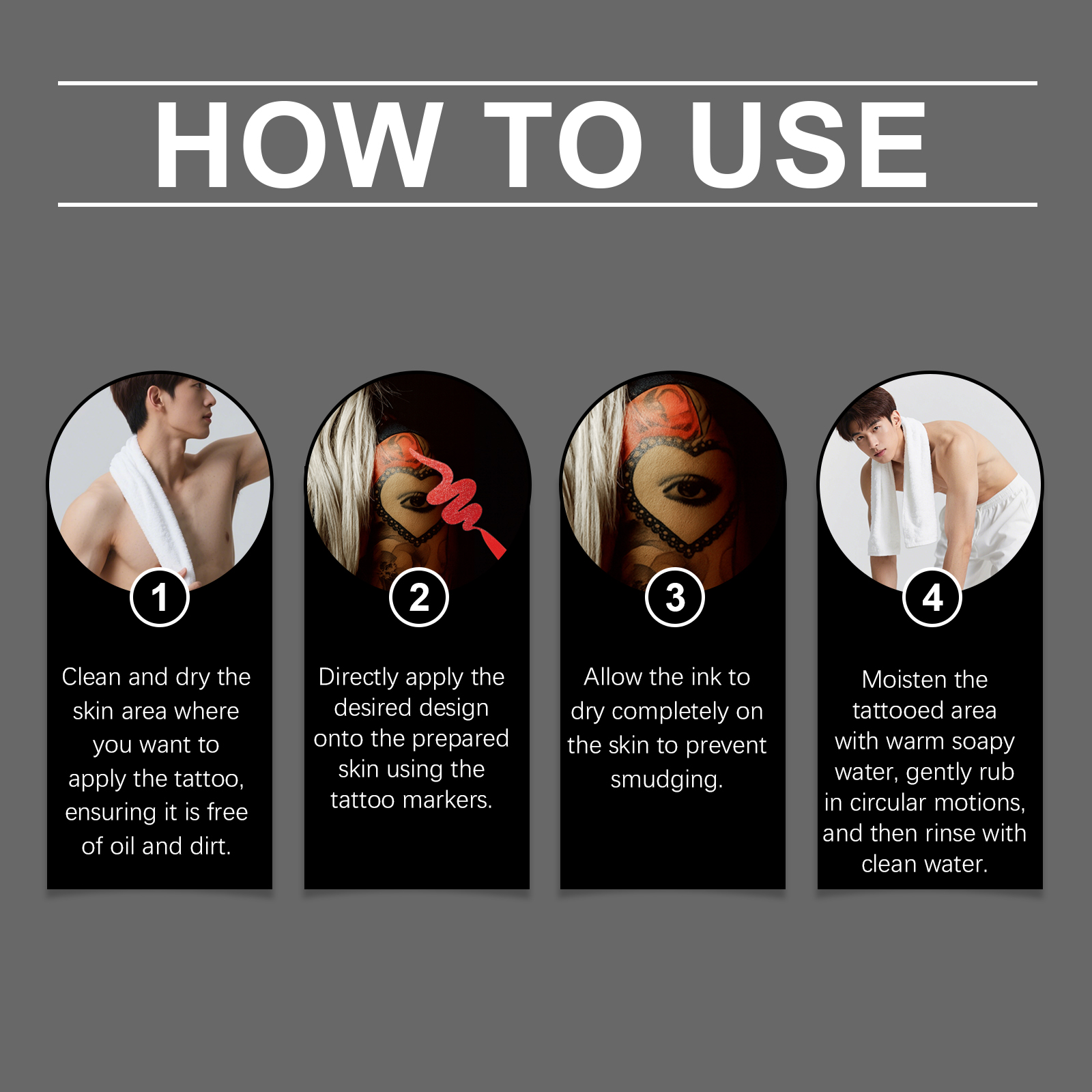 我们的临时纹身彩绘笔,由聚乙烯醇、云母精心调配而成。专为温和配方无刺激,敏感肌也能使用,清水或卸妆产品可轻松去除图案设计。使用方法极为便捷:1.清洁并擦干需纹身的皮肤区域,确保无油脂污垢。2. 直接用彩绘笔在备好的皮肤上涂抹心仪图案。3. 等待笔中墨水在皮肤表面完全干透,防止褪色。4. 用温肥皂水浸湿纹身区域,打圈擦拭后清水冲洗即可。并且笔状设计易操作,快速勾勒纹身图案,丰富色彩适配不同场景风格需求