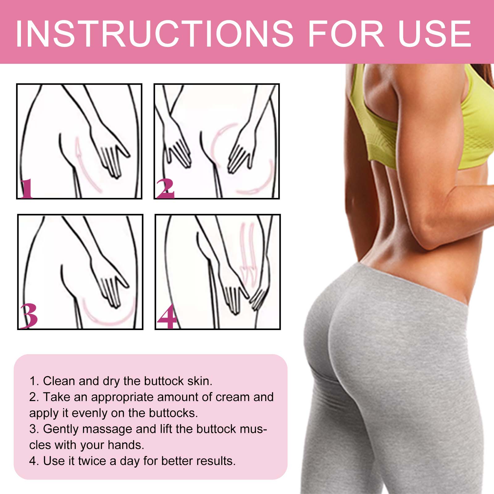 我们的提臀霜液含有玛卡根提取物、乳木果油、人参提取物。它可以使臀肌的元素刺激皮肤的新陈代谢,促进臀部肌肉的发育,从而使臀部和臀部更加紧致饱满。它的使用方法很简单:首先清洁并擦干臀部皮肤,然后取适量面霜均匀涂抹于臀部,接着用手轻轻按摩、提抬臀部肌肉,为了更好的效果,每天使用两次。让臀部更加丰满。