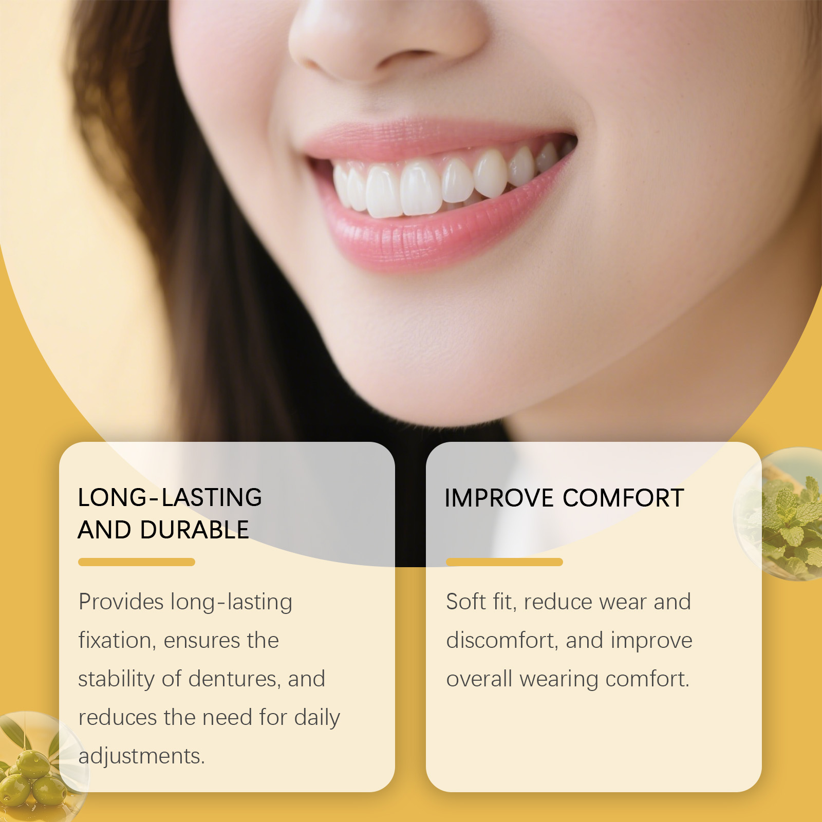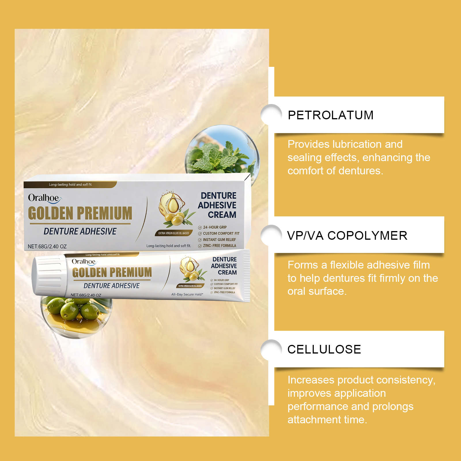 我们的假牙固定粘合剂,由薄荷脑、橄榄油精心调配而成。专为提供持久的固定效果,确保假牙的稳定性设计。使用方法极为便捷:1.清洁并干燥假牙;2.将本产品挤入假牙基底的各个部分;3.保持口腔清洁,口中佩戴假牙;4.咬几秒钟,等待假牙稳定。并且柔软贴合,减少磨损和不适感,并提高整体佩戴舒适度。
