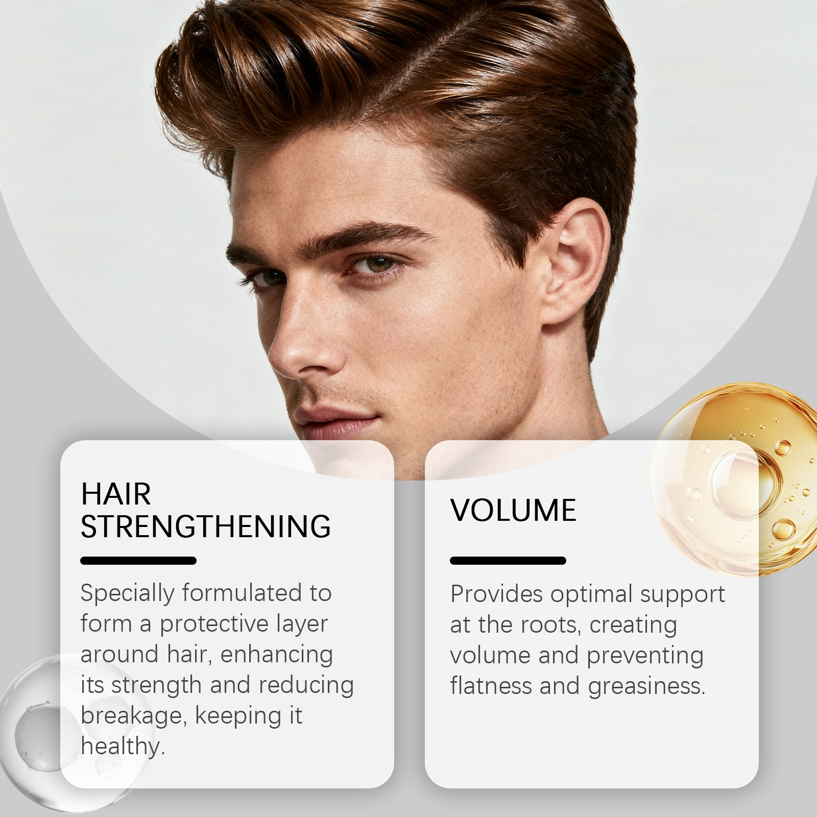 我们的男士定型发胶喷雾,由生育酚、甘油精心调配而成。专为增强头发强度并减少断裂设计。使用方法极为便捷:清洁并干燥头发。充分摇匀。在距离头部6-8厘米处喷洒适量产品,用手指或梳子梳理出理想的发型。并且可以在发根处提供最佳支撑,增加体积并防止扁平和油腻。