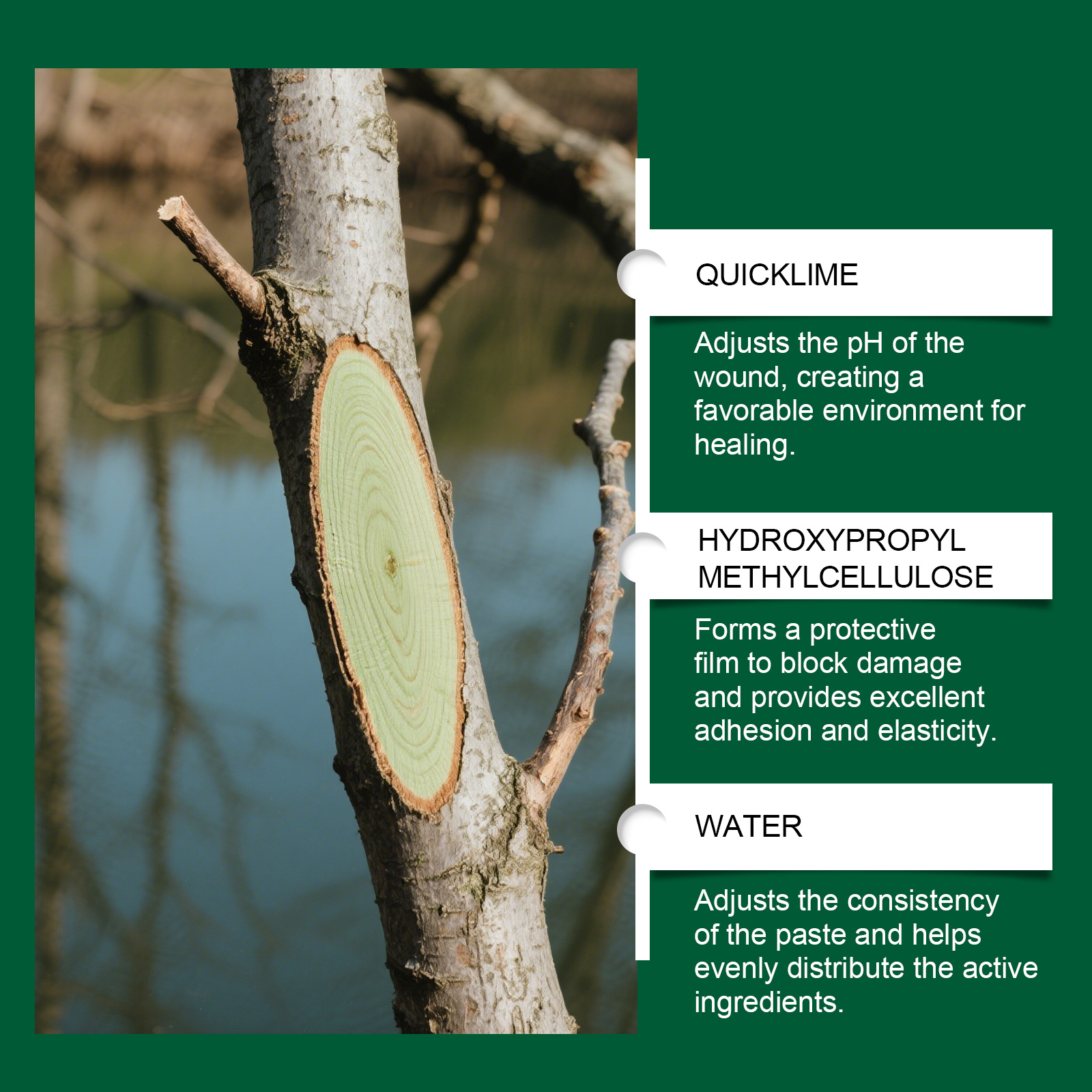 我们的植物伤口愈合剂,由生石灰、羟丙基甲基纤维素精心调配而成。专为帮助树木伤口快速形成保护层,减少水分流失,防止伤害侵入设计。使用方法极为便捷:1.使用锋利的刀将伤口边缘平整,使其平整干燥;2.使用刷子取适量本品,并均匀地涂抹在伤口表面。并且它可以促进树木自我修复过程,适用于多种树木修剪伤口。