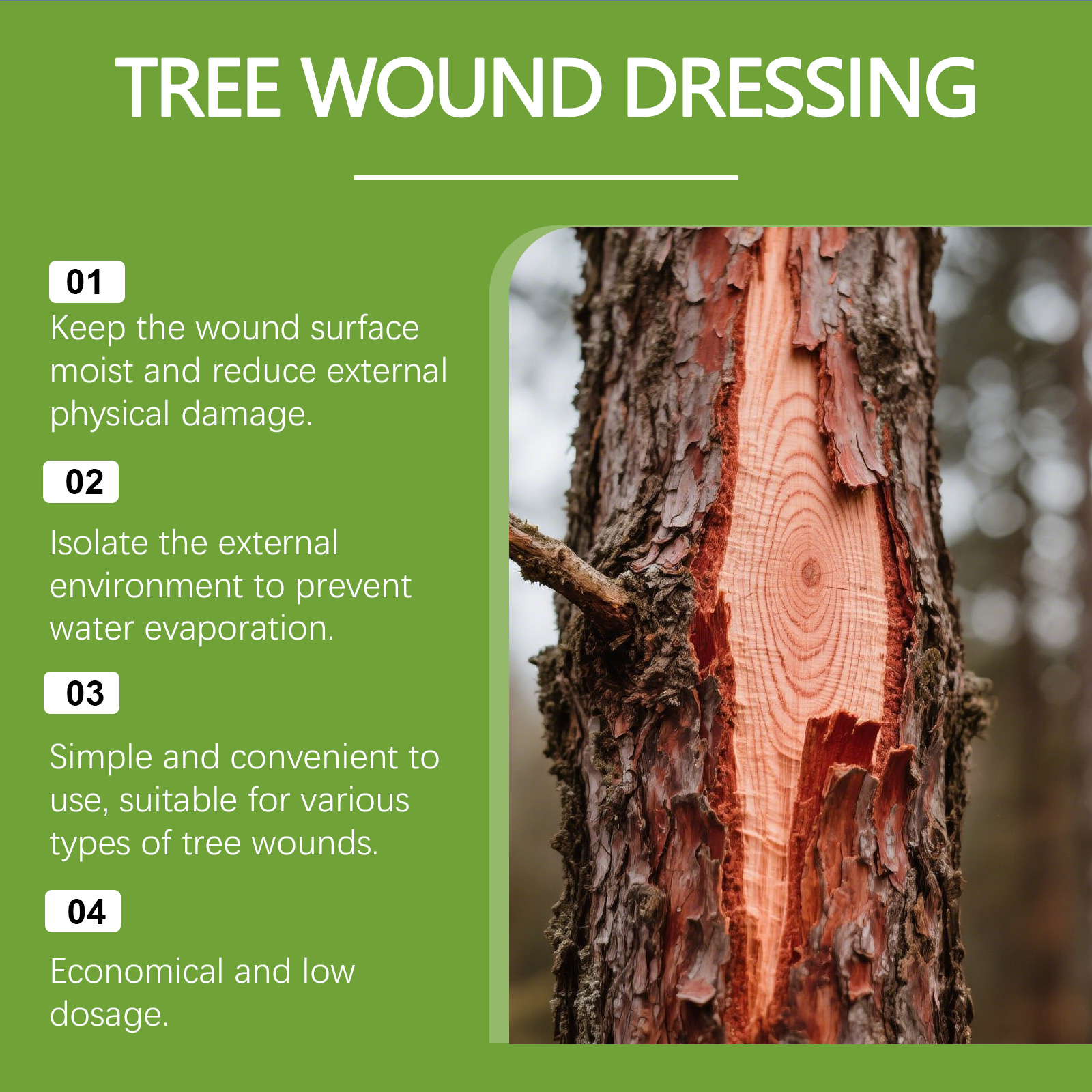 我们的树木伤囗愈合膏,由生石灰、羟丙基甲基纤维素精心调配而成。专为帮助树木伤口快速形成保护层,减少水分流失,防止伤害侵入设计。使用方法极为便捷:1.使用锋利的刀将伤口边缘平整,使其平整干燥;2.使用刷子取适量本品,并均匀地涂抹在伤口表面。并且它可以促进树木自我修复过程,适用于多种树木修剪伤口。
