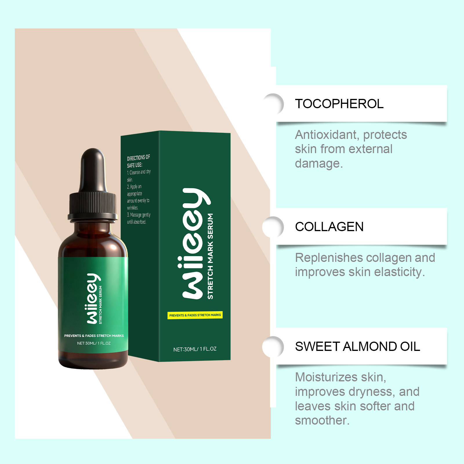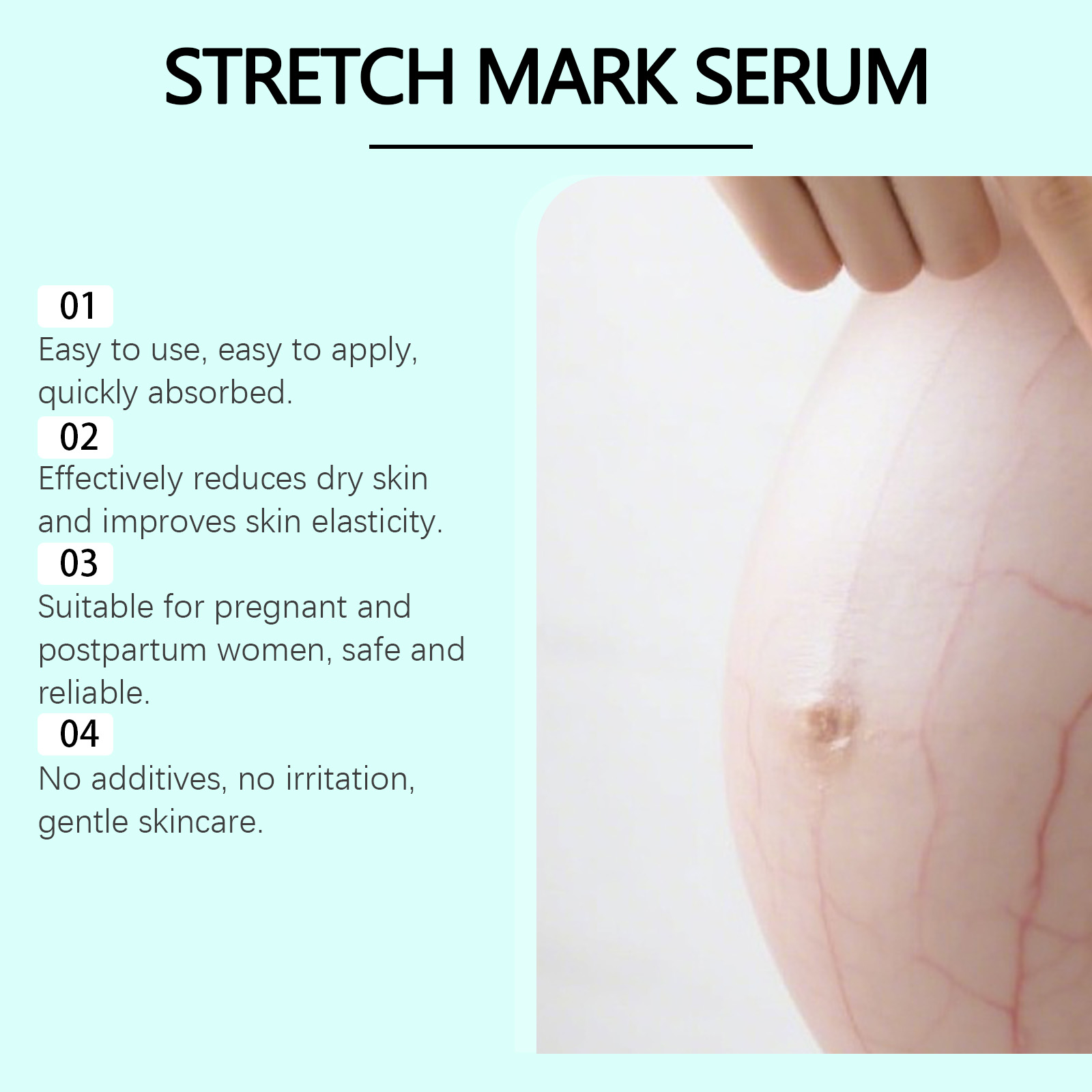 我们的孕期护理精华液,由甘油、氢化蓖麻油精心调配而成。专为深层滋养肌肤,提升弹性紧致度设计。使用方法极为便捷:1.清洁皮肤并保持干燥。2.取出适量本品均匀涂抹在皱纹处。3.轻柔按摩吸收。并且它可以有效淡化妊娠纹痕迹,改善肤质,重现平滑触感,渗透快易吸收,持续修护疤痕,增强肌肤韧性。