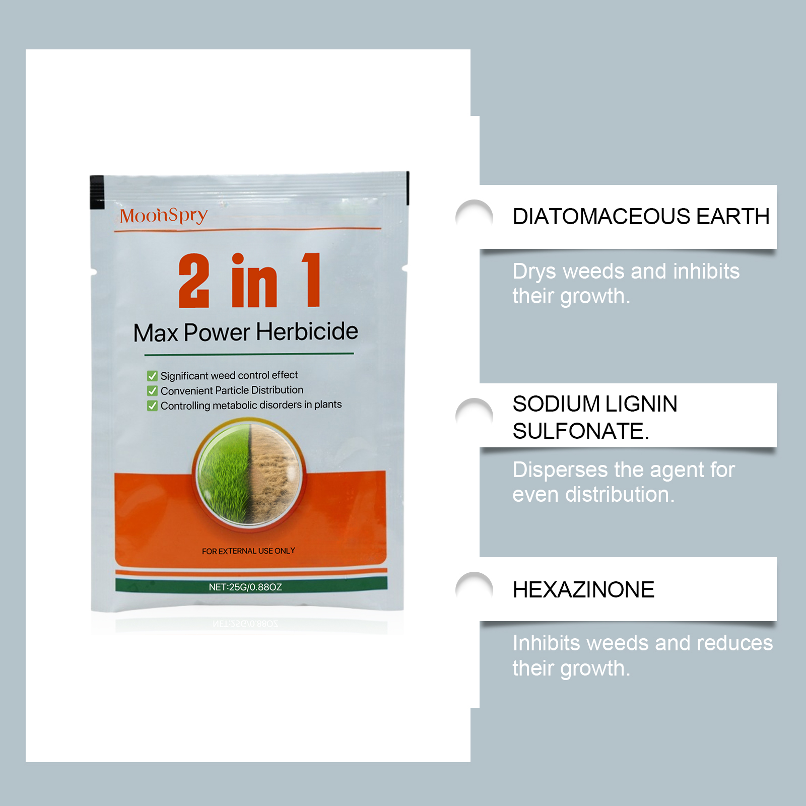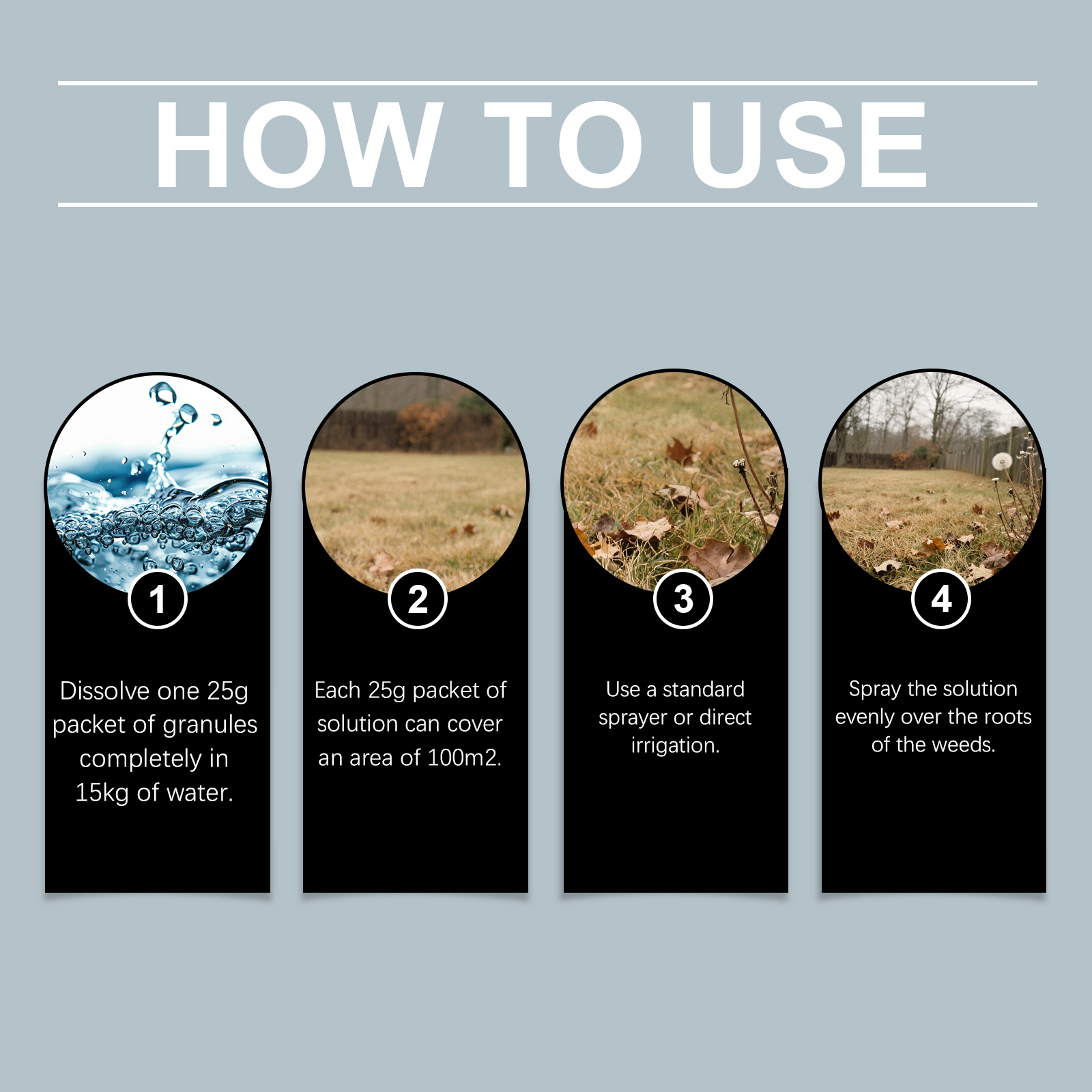 我们的除草剂,由木质素磺酸钠、环嗪酮精心调配而成。专为有效控制一年生和二年生杂草设计。使用方法极为便捷:将一包25克的颗粒完全溶解在15公斤水中。每包25克溶液可以覆盖100平方米的面积。使用标准喷雾器或直接灌溉。将溶液均匀喷洒在杂草的根部。并且不含刺激性化学物质对人体安全。