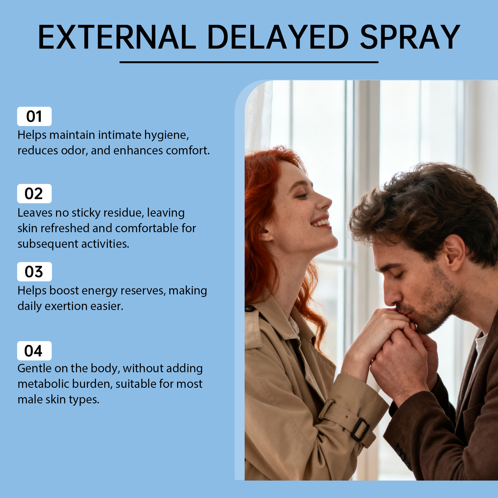 我们的男性身体护理喷雾,由虎杖根提取物、丁香叶油精心调配而成。专为提升男性日常活力,增强体力,并改善精神状态设计。使用方法极为便捷:1.彻底清洁并擦干你的私处。2.在性活动前约10分钟,将适量本产品喷洒在私处。3.轻轻按摩直至吸收。并且可以提供温和的肾脏健康支持,帮助维持稳定的肾功能。