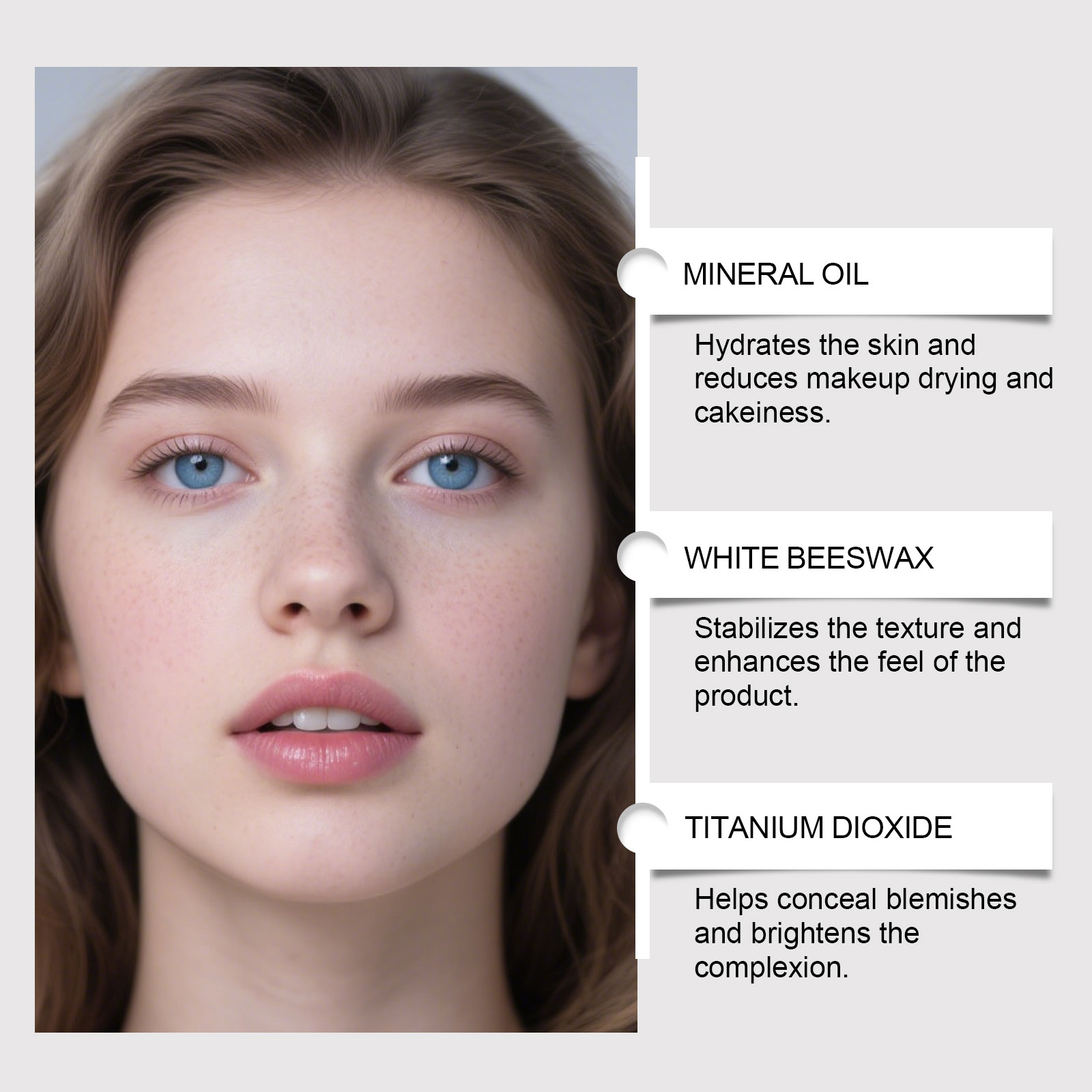 我们的象牙白保湿粉底棒,由矿油、白蜂蜡精心调配而成。专为修饰肤色不均、暗沉问题,让肌肤呈现自然透亮的健康光泽设计。使用方法极为便捷:1. 护肤后吸去面部多余油脂,做好妆前准备。2. 旋出1-2cm膏体,在瑕疵处点涂,避免堆积。3. 用指腹或湿美妆蛋推开晕染,衔接肤色。4. 全脸薄涂提亮,用美妆蛋扫匀,打造雾面妆效。5. 妆干后轻扫散粉定妆,重点按压易出油部位。并且它可以有效遮盖面部斑点、痘印、泛红等瑕疵,打造细腻无瑕妆面,可兼作修容与高光使用,轻松塑造面部轮廓,提升妆面精致度。