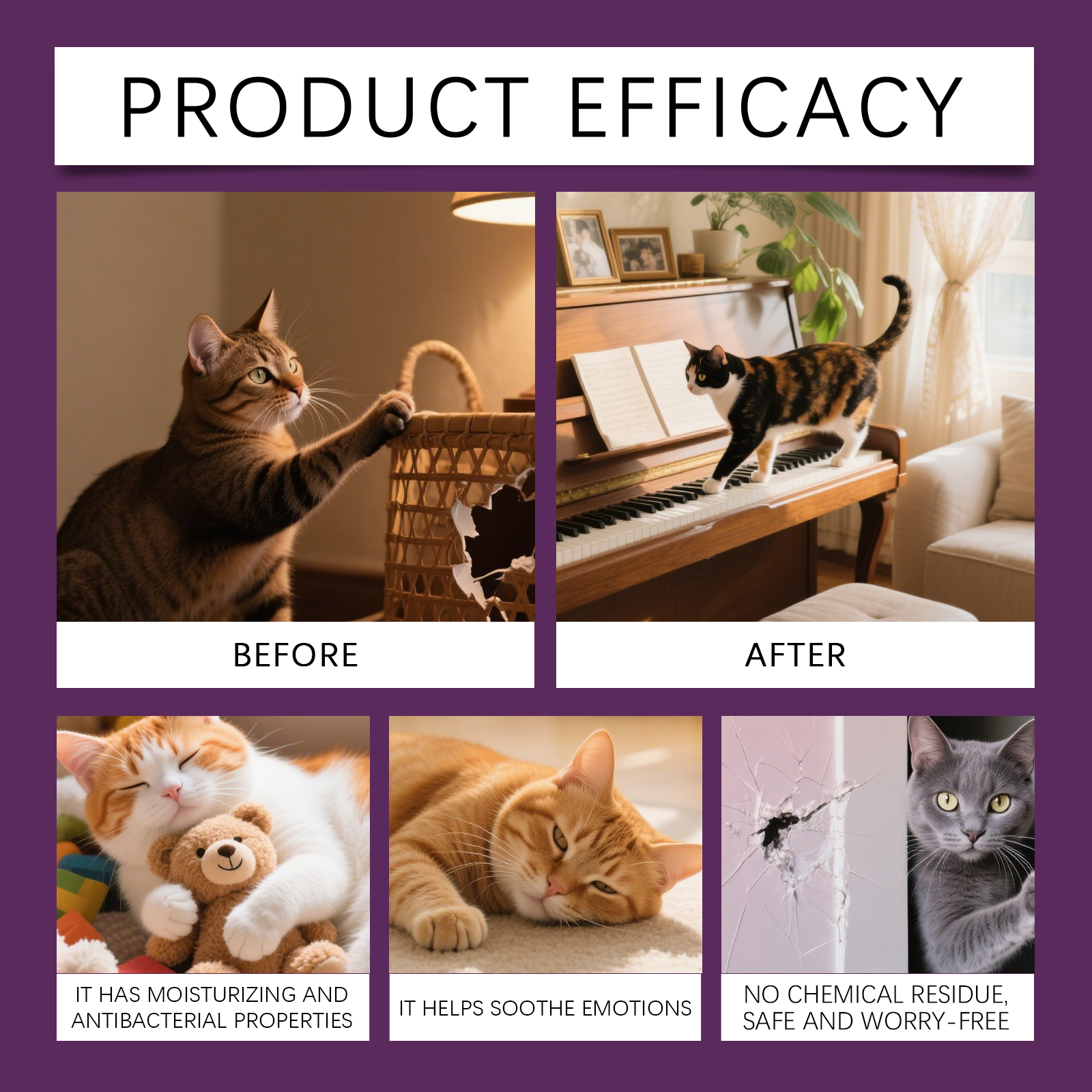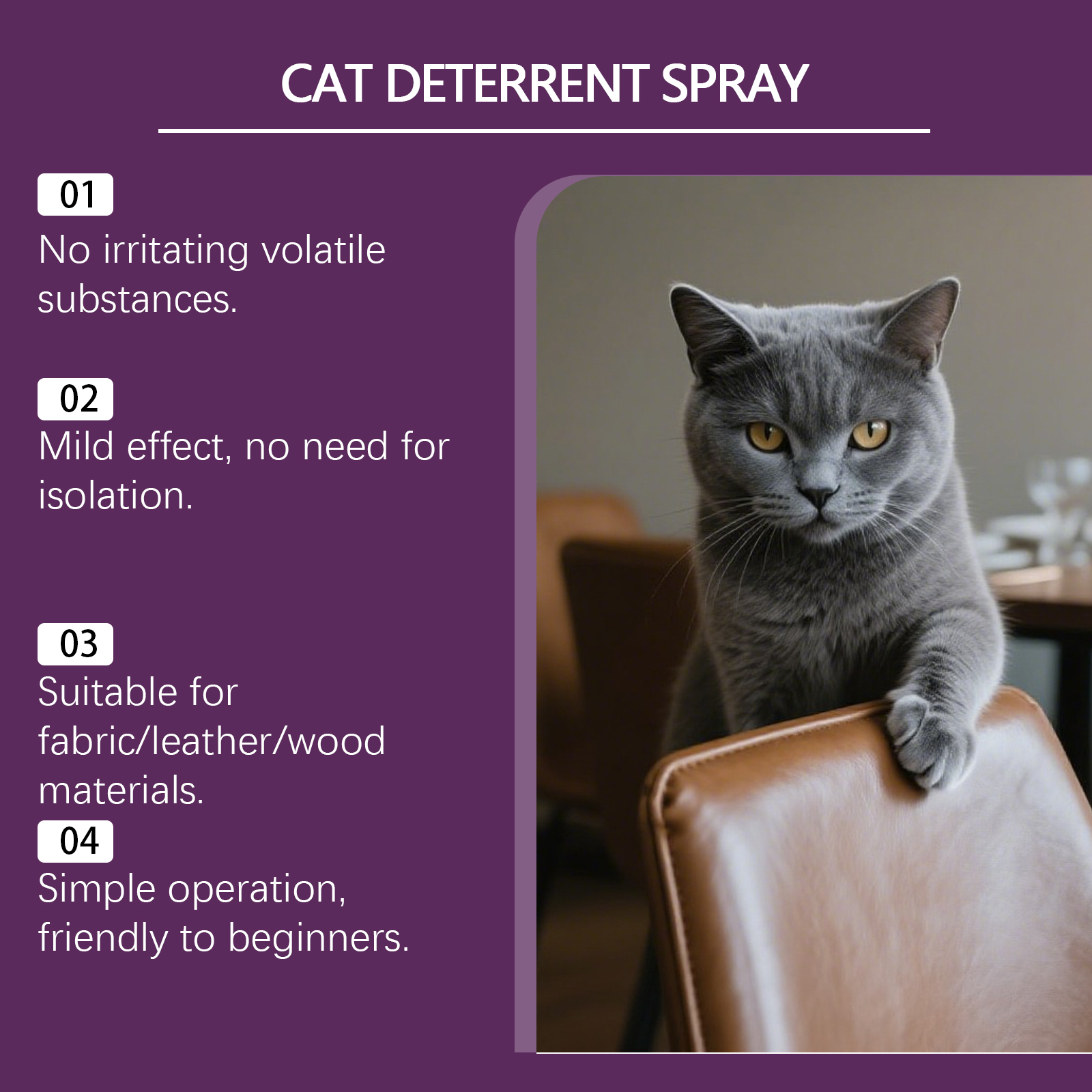 我们的猫咪防刮喷雾,由去离子水、1,2-己二醇、苦参素精心调配而成。专为有效防止猫咪抓挠沙发、地毯、植物等物品,减少破坏设计。使用方法极为便捷:使用前摇匀瓶身10秒;喷洒目标区域每日3-4次;结合正向奖励强化记忆;观察反应动态调整用量。并且可以通过嗅觉引导建立行为边界意识。