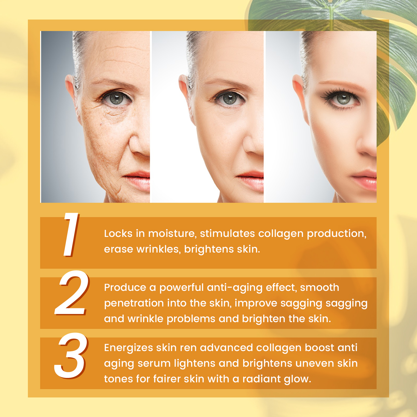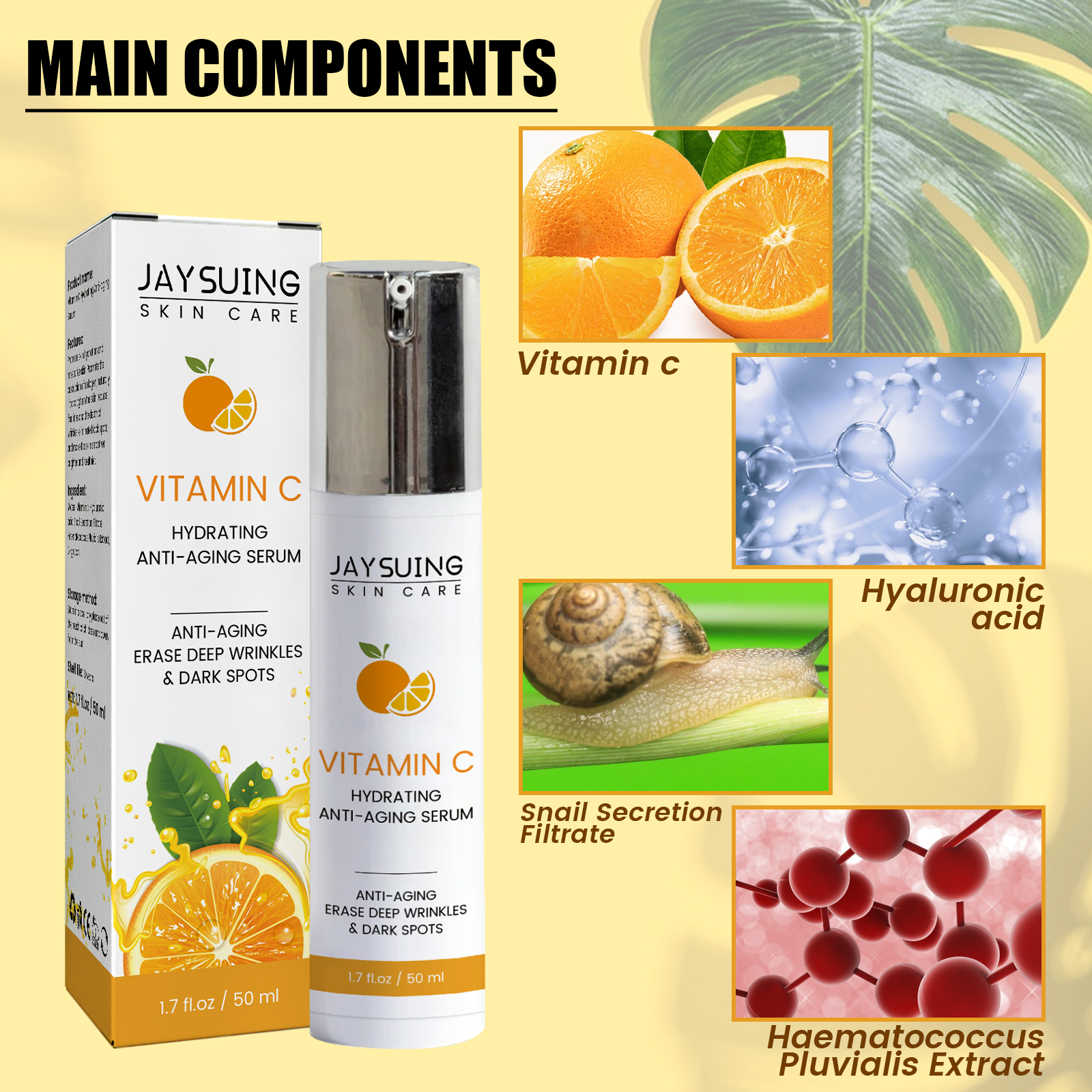 我们的维生素C保湿抗皱精华含有维生素c、透明质酸、蜗牛分泌物滤液。它可以抗皱,透明质酸、天然抗氧化剂增加皮肤水分,植物基氨基混合物,促进胶原蛋白生成,自然提皱,紧致肌肤光滑、明亮、健康的肤色。它的使用方法很简单:取适量精华液于掌心,均匀涂抹于面部,轻轻按摩、拍打至吸收即可。更明亮的皮肤,即时保湿,减少细纹和皱纹,减少黄褐斑,深层的滋养,渗透保湿,改善肌肤,平滑皱纹。