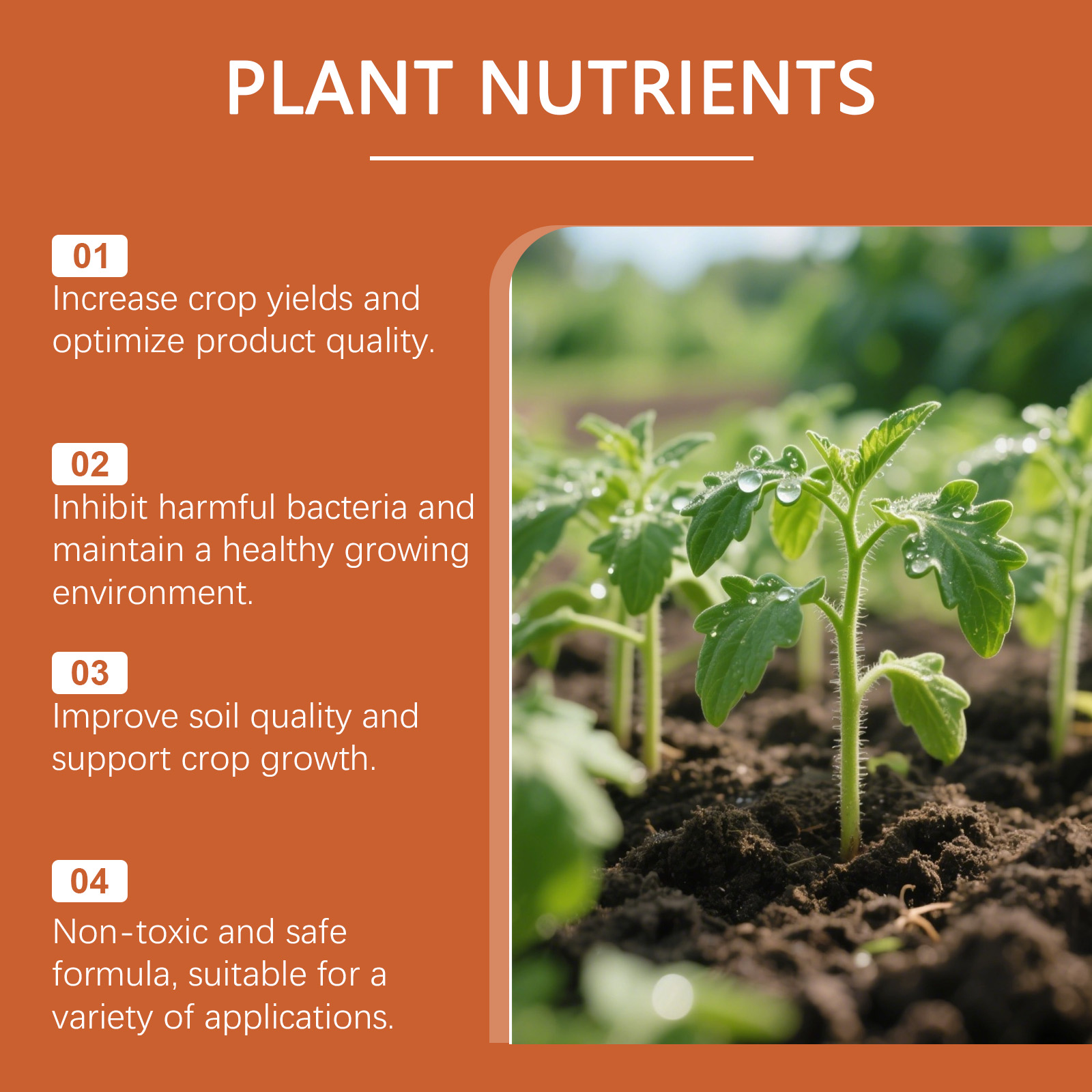 我们的植物营养剂,由PCA 钠、尿素精心调配而成。专为有效提升植物产量与品质,为作物生长提供关键助力,助力种植成果提升设计。使用方法极为便捷:直接均匀滴灌本品施肥,每7-15天重新施肥一次。并且可以作用于土壤并改善其质量,为作物提供好基础。