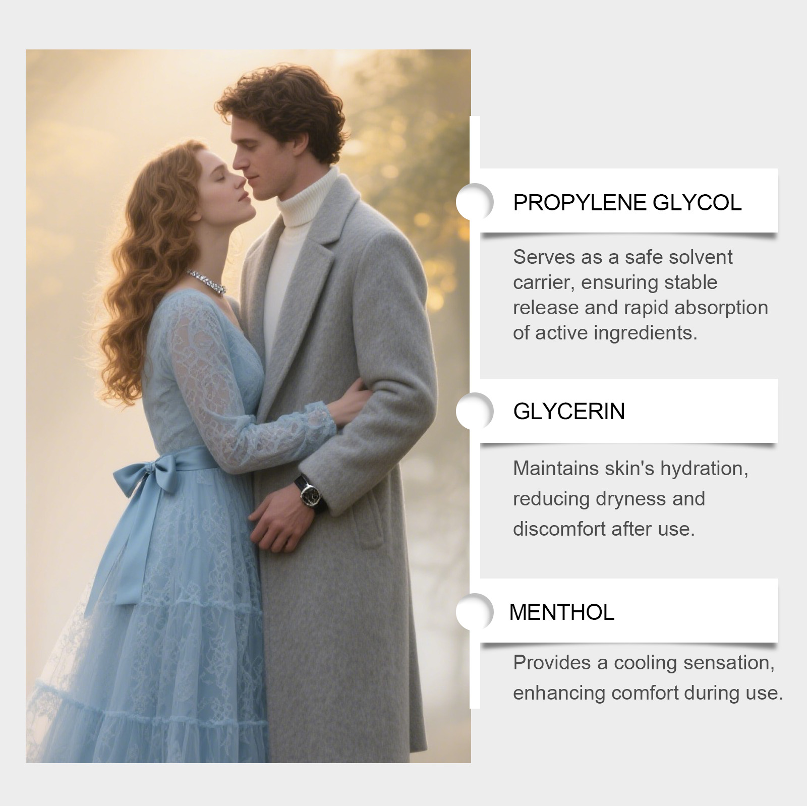 我们的男士护理凝胶,由三乙醇胺、薄荷脑精心调配而成。专为改善局部血液循环,带来更自然的亲密体验设计。使用方法极为便捷:清洁并擦干你的私处。取适量并均匀涂抹在私处。轻轻按摩直至吸收。并且采用温和配方,可以增强触感并避免过度麻木。