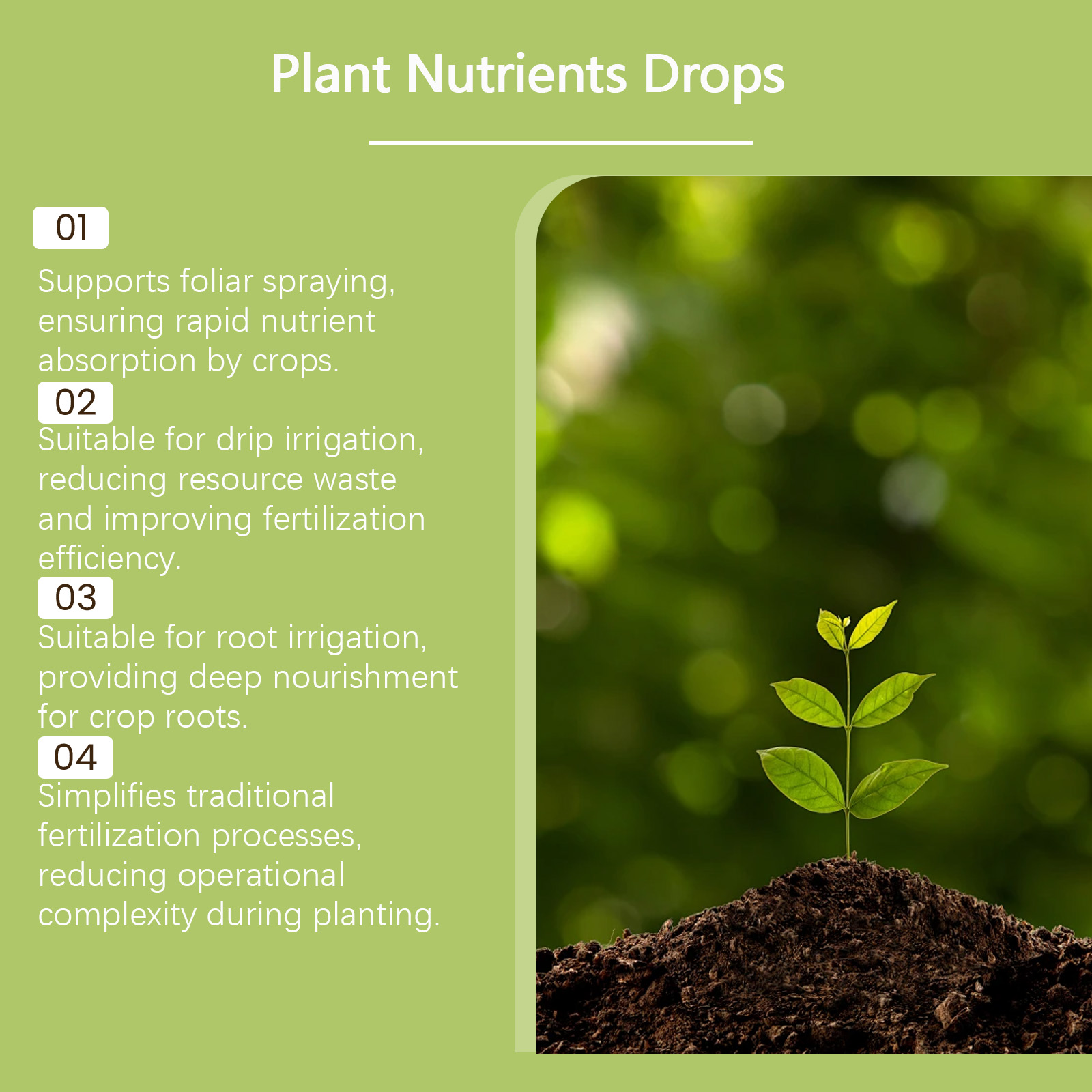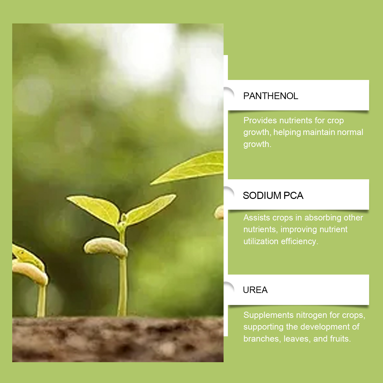 我们的植物营养滴剂,由泛醇、PCA 钠、尿素精心调配而成。专为改善土壤质量,优化植物生长的土壤环境设计。使用方法极为便捷:直接均匀滴灌本品施肥,每7-15天重新施肥一次。并且可以抑制有害细菌,维护种植环境。