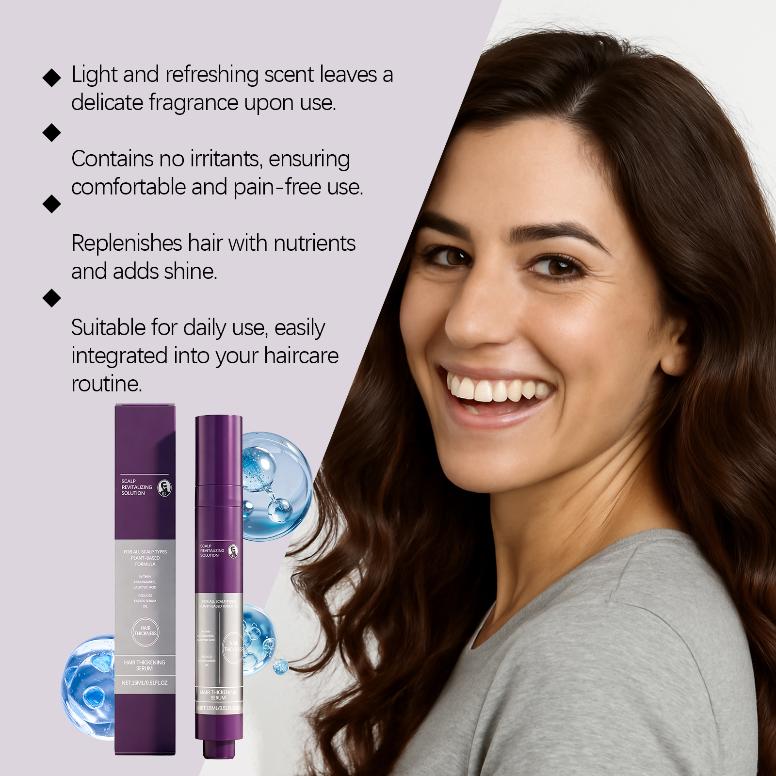 我们的清爽护发精华,由甘油、生育酚(维生素E)精心调配而成。专为深度护理受损的发根,滋养毛囊,让头发更加浓密,具有深层滋养的效果,能够滋养头皮,让其充满生机设计。使用方法极为便捷:1.完全清洁头发和头皮并干燥。2.将适量本产品滚动涂抹在头皮上。3.轻轻按摩促进更好吸收。并且它可以防止脱发和断发,确保头发更强壮和健康,温和配方,不会对头皮和头发造成负担,呵护您秀发的健康。