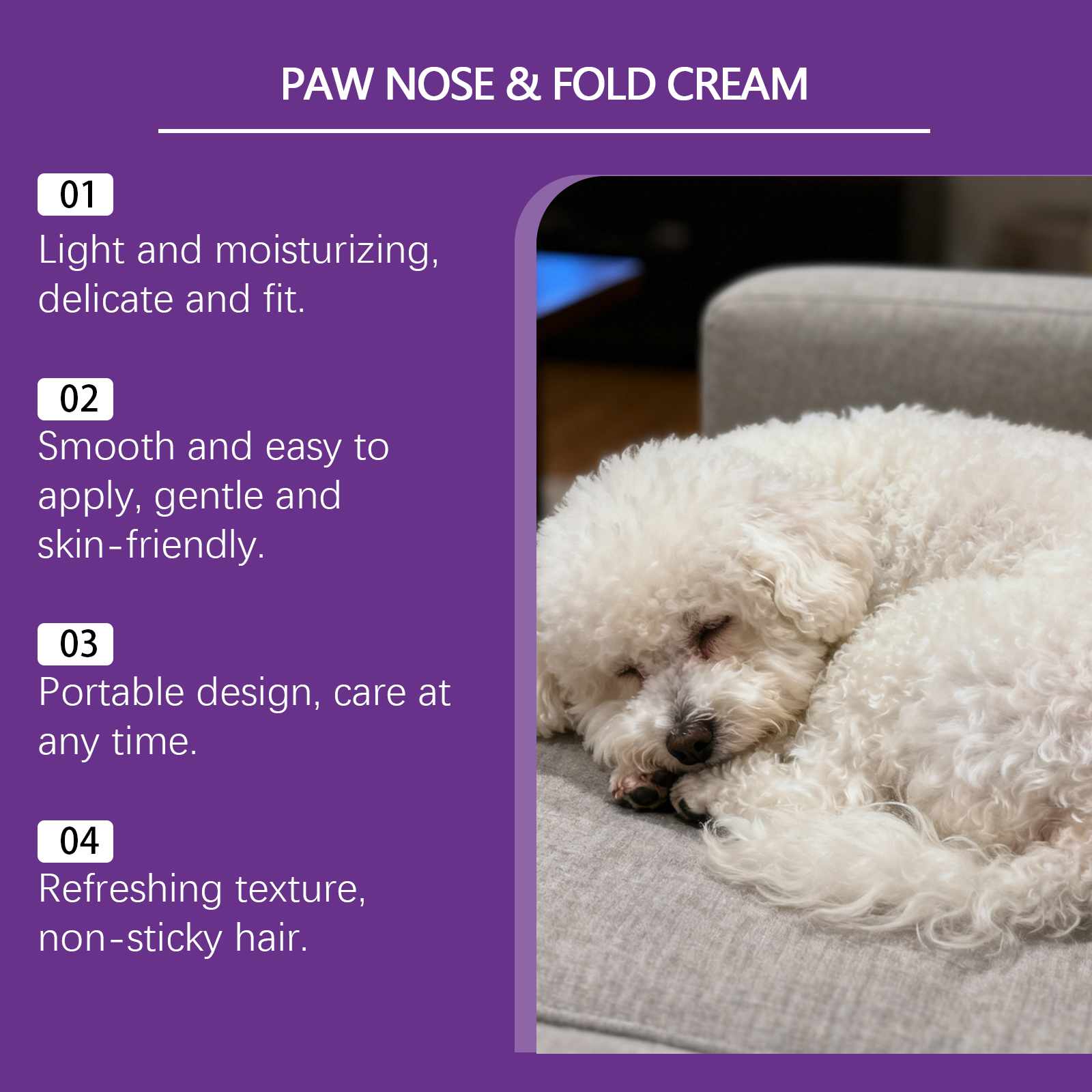 我们的宠物护爪霜,由芦荟提取物、椰子油精心调配而成。专为深层滋养爪子,保护宠物健康设计。使用方法极为便捷:在使用前清洁并擦干宠物的脚、鼻子或皮肤褶皱。将适量涂抹在宠物的脚、鼻子或皮肤褶皱处。轻轻按摩,以促进吸收。并且具有轻盈细腻的质地,易于涂抹和吸收。