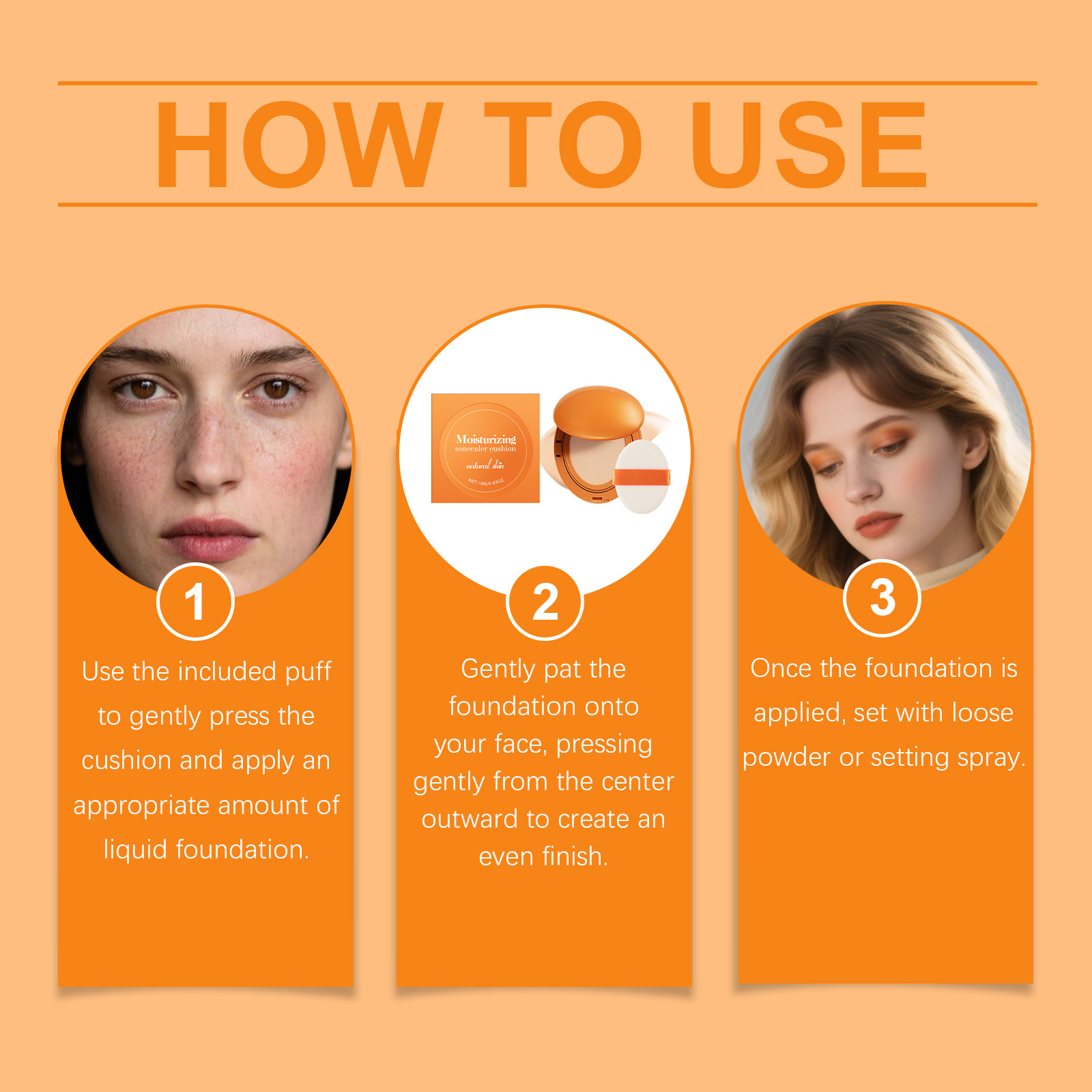 我们的保湿遮瑕气垫(自然色),由氧化锌、生育酚(维生素E)精心调配而成。专为有效遮盖瑕疵并均匀肤色设计。使用方法极为便捷:使用附带的粉扑轻轻按压气垫,并涂抹适量的液体粉底。轻轻拍打粉底液,从脸部中心向外按压,以达到均匀的妆效。涂抹粉底后,用散粉或定妆喷雾固定。并且可以持久保湿,使皮肤全天候保持水润。