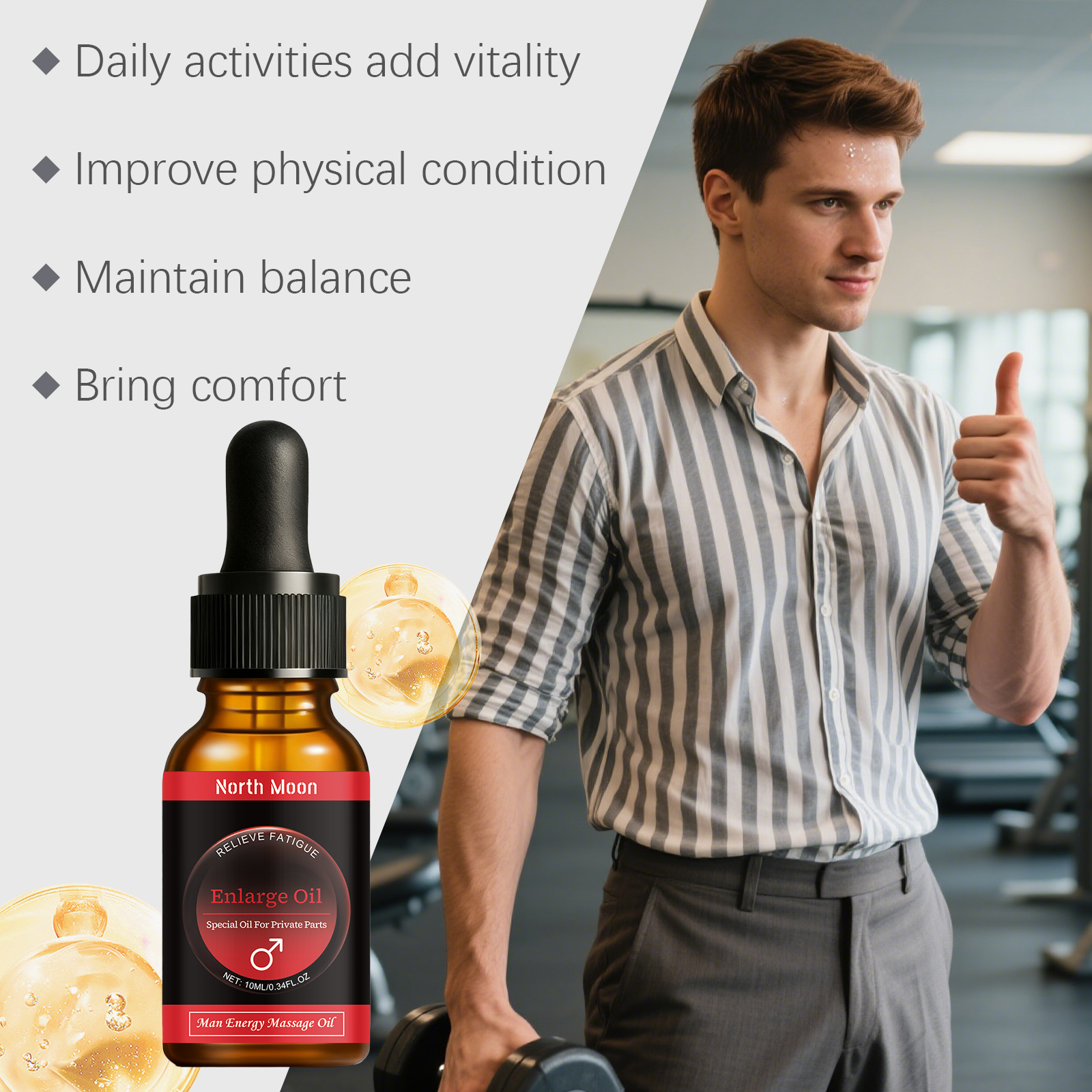 我们的男性身体滋养精油,由淫羊藿提取物、姜根提取物精心调配而成。专为为日常生活注入活力设计。使用方法极为便捷:1.清洁并擦干皮肤。2.将液体涂抹在皮肤上并按摩至吸收。并且可以保持身心的协调。
