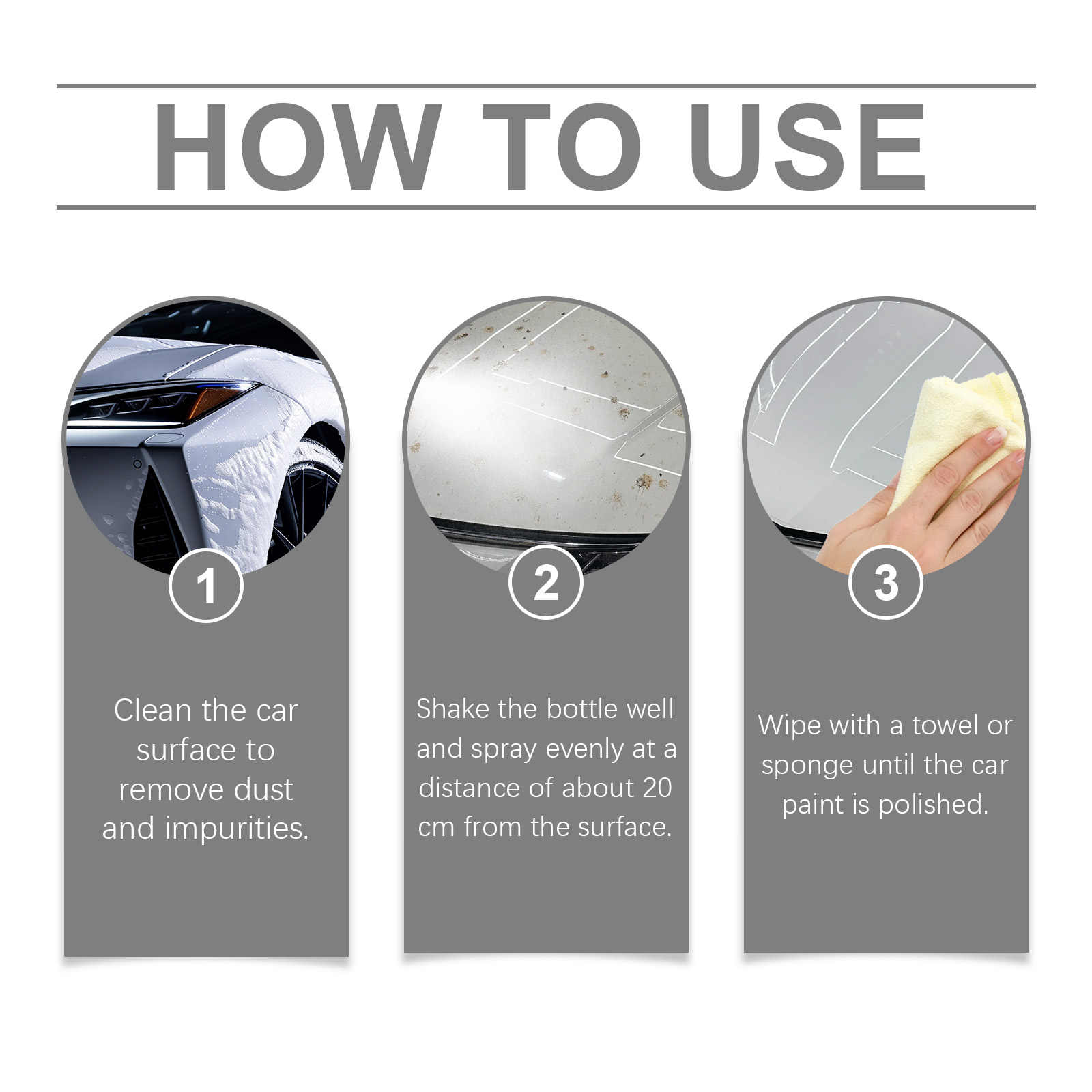 我们的汽车镀膜喷雾(120ml)含有PE。它可以在表面形成保护膜,防刮痕,防酸雨,抗高温,持久保护。它的使用方法很简单:清洗完汽车漆面后,将本品喷在表面, 拿出毛巾或海绵,将液体均匀涂抹,等它变干。并且可以提升漆面光泽。