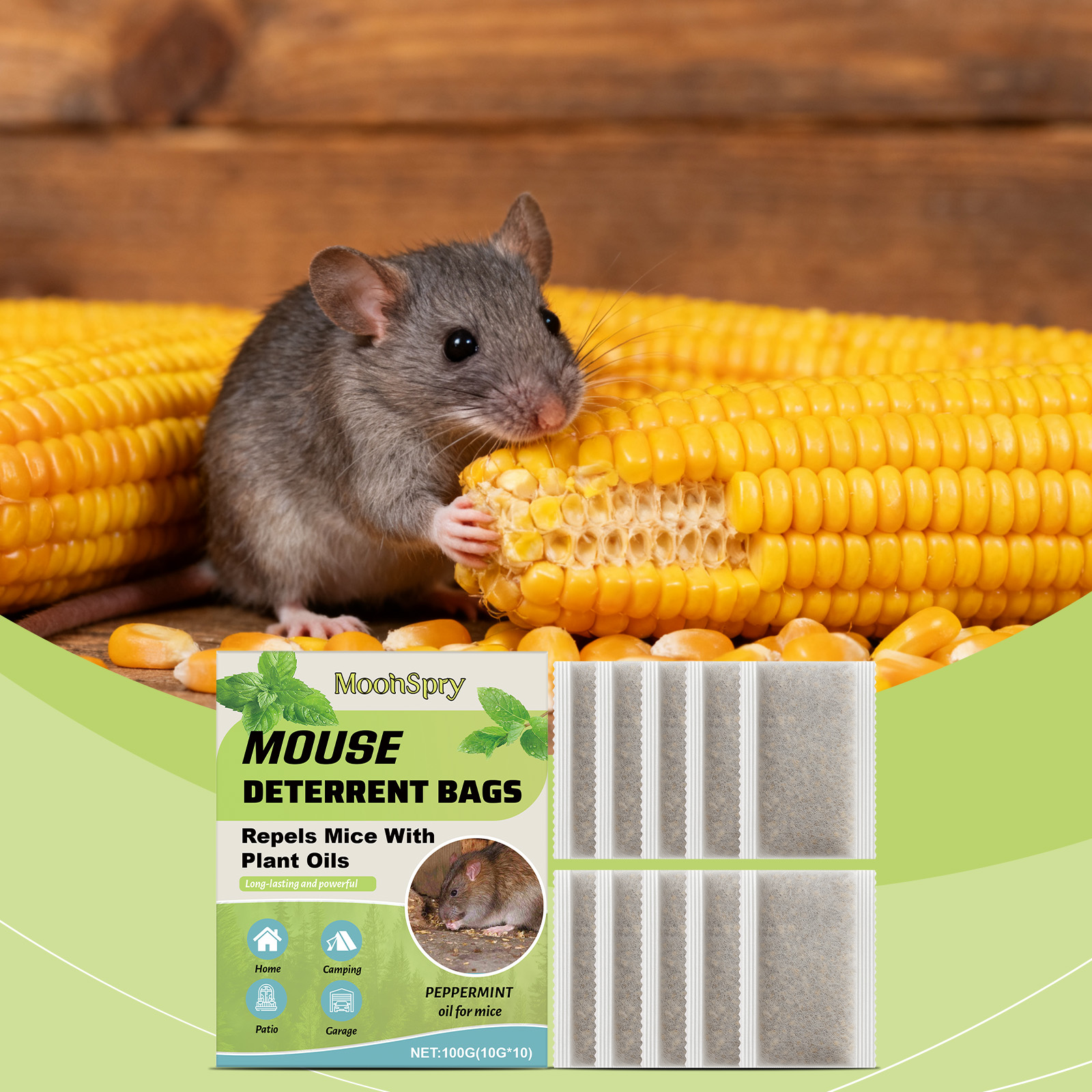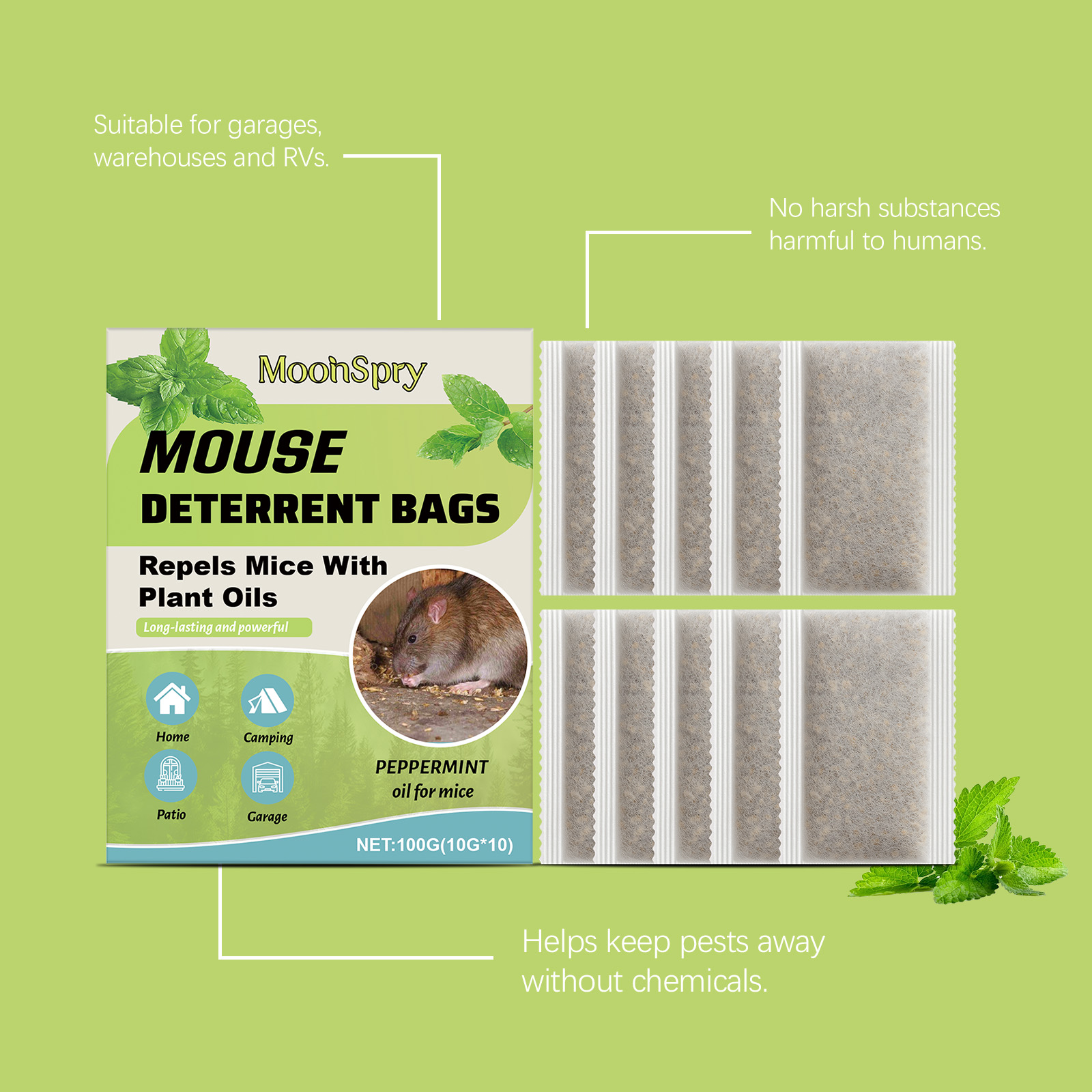 我们的害虫驱避包,由玉米仁粗粉、硅藻土精心调配而成。专为有效驱避老鼠等害虫,提供持久害虫防护设计。使用方法极为便捷:1. 目标区域放置1-2包。2. 包与包间距 2-3 米。3. 定期每 30-45 天更换。4. 避光阴凉干燥处存放。并且它可以适用于家居、露台及露营,散发薄荷味驱避害虫。