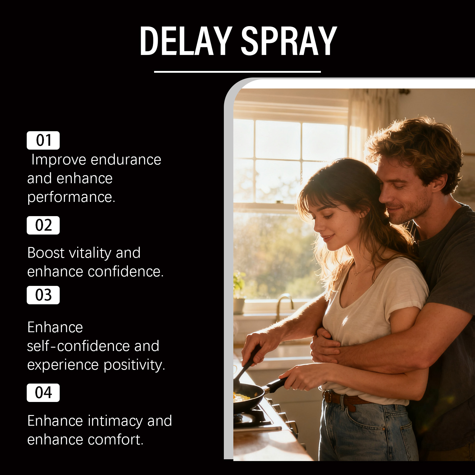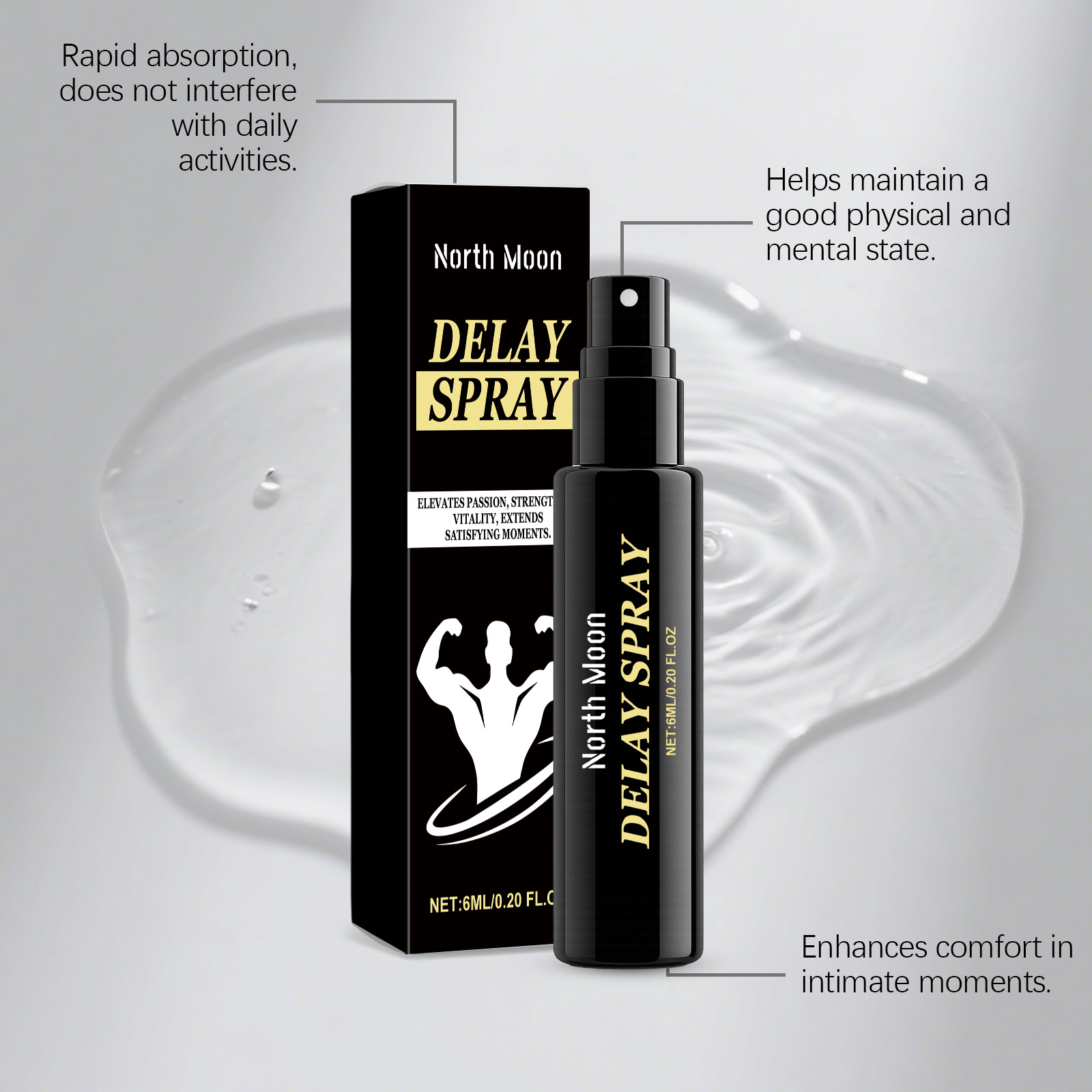 我们的男士护理喷雾,由淫羊藿提取物、姜根提取物精心调配而成。专为促进积极体验设计。使用方法极为便捷:清洁并干燥你的私处,在你的私处喷洒适量的量,让其吸收。并且可以改善关系舒适度。