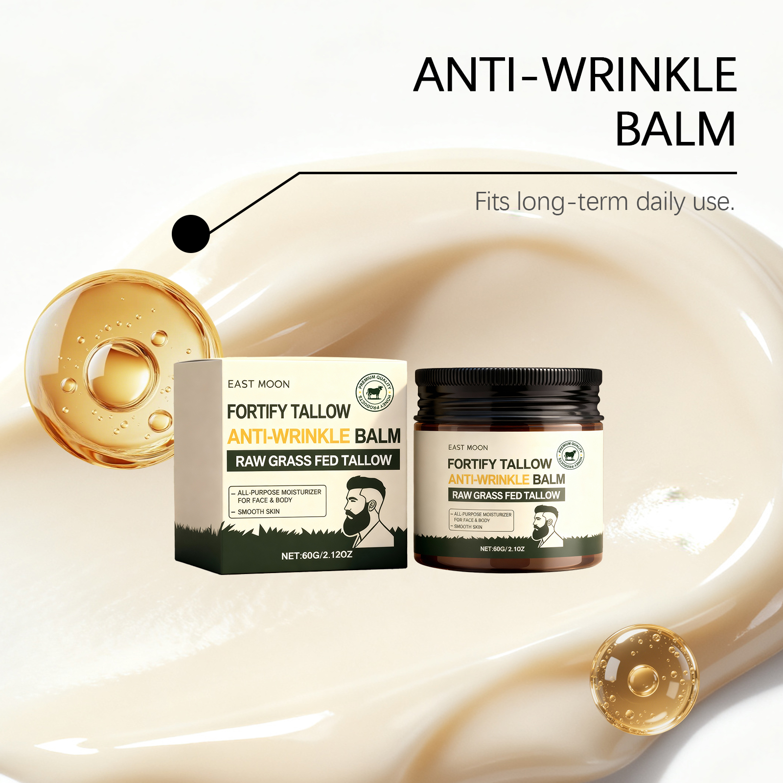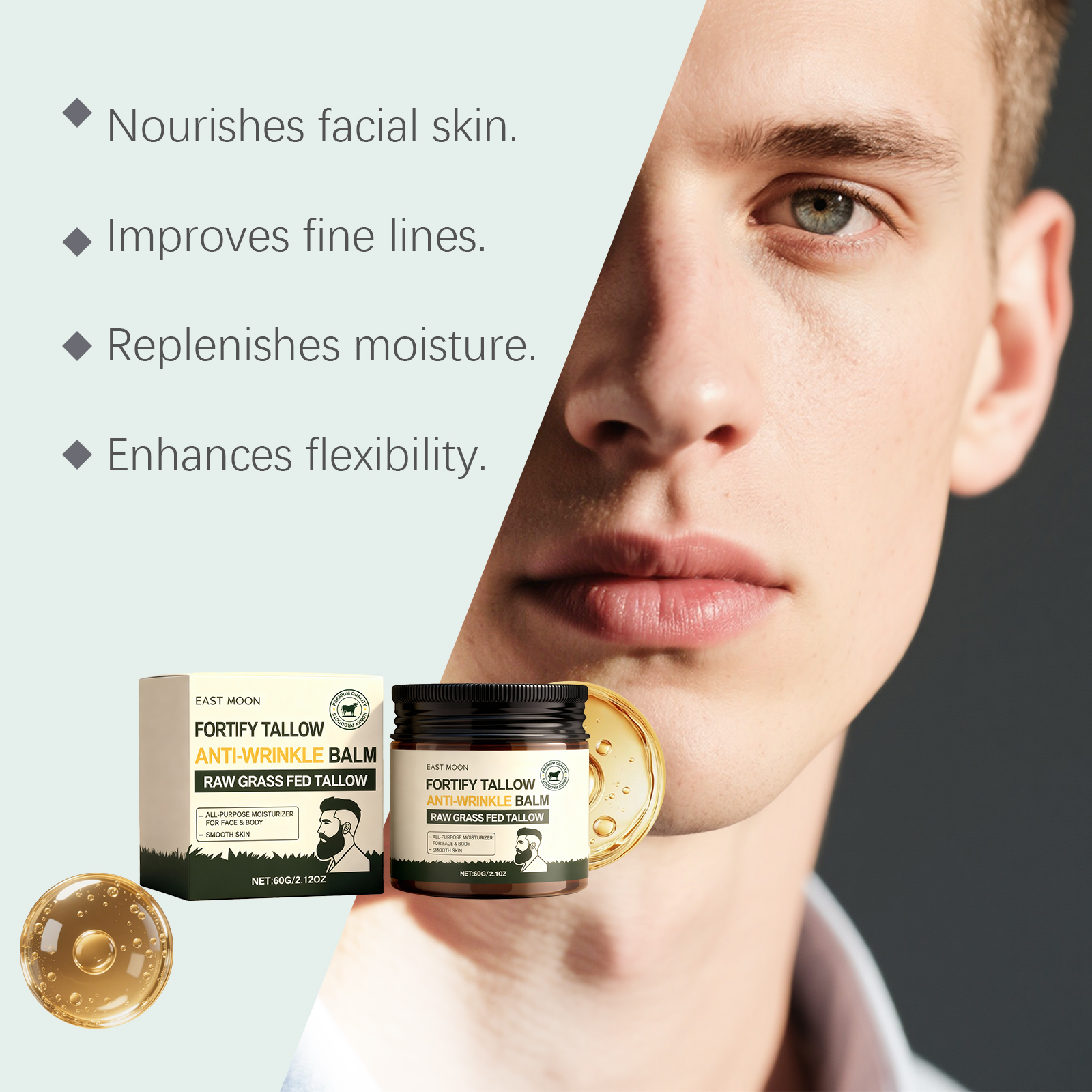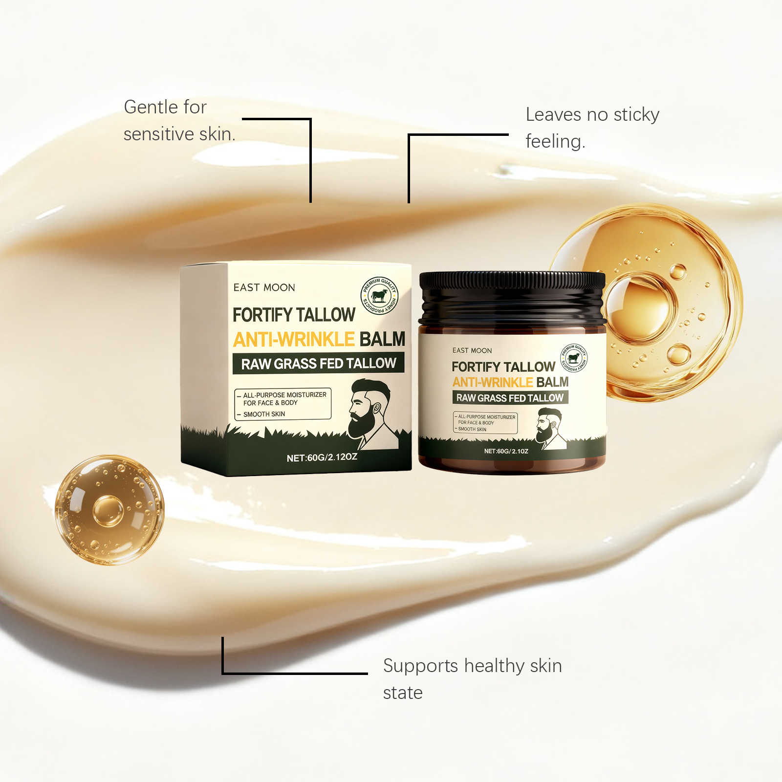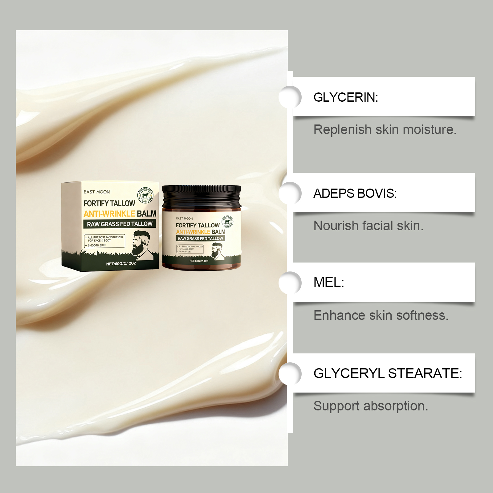 我们的男士牛脂滋润霜 ,由精氨酸、牛脂、蜂蜜精心调配而成。专为深层呵护肌肤设计。使用方法极为便捷:清洁并擦干皮肤。取适量本品涂抹于皮肤。轻轻按摩至吸收。并且可以抚平细纹。