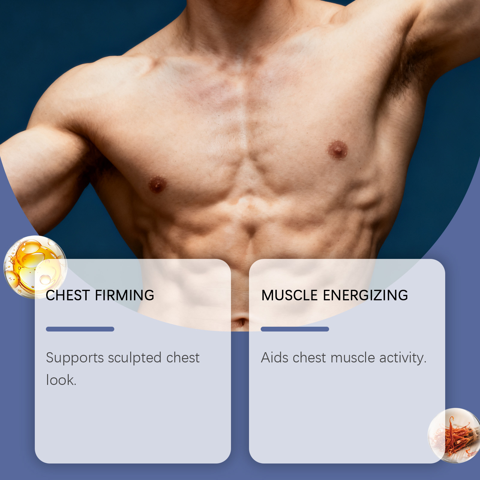 我们的男士胸部紧致贴,由红花提取物、姜黄根粉精心调配而成。专为支持雕塑胸部外观设计。使用方法极为便捷:清洁胸部皮肤,取出产品并涂抹在胸部,避开乳头,并轻轻按压边缘,以确保其牢固固定。并且有助于胸部肌肉活动。