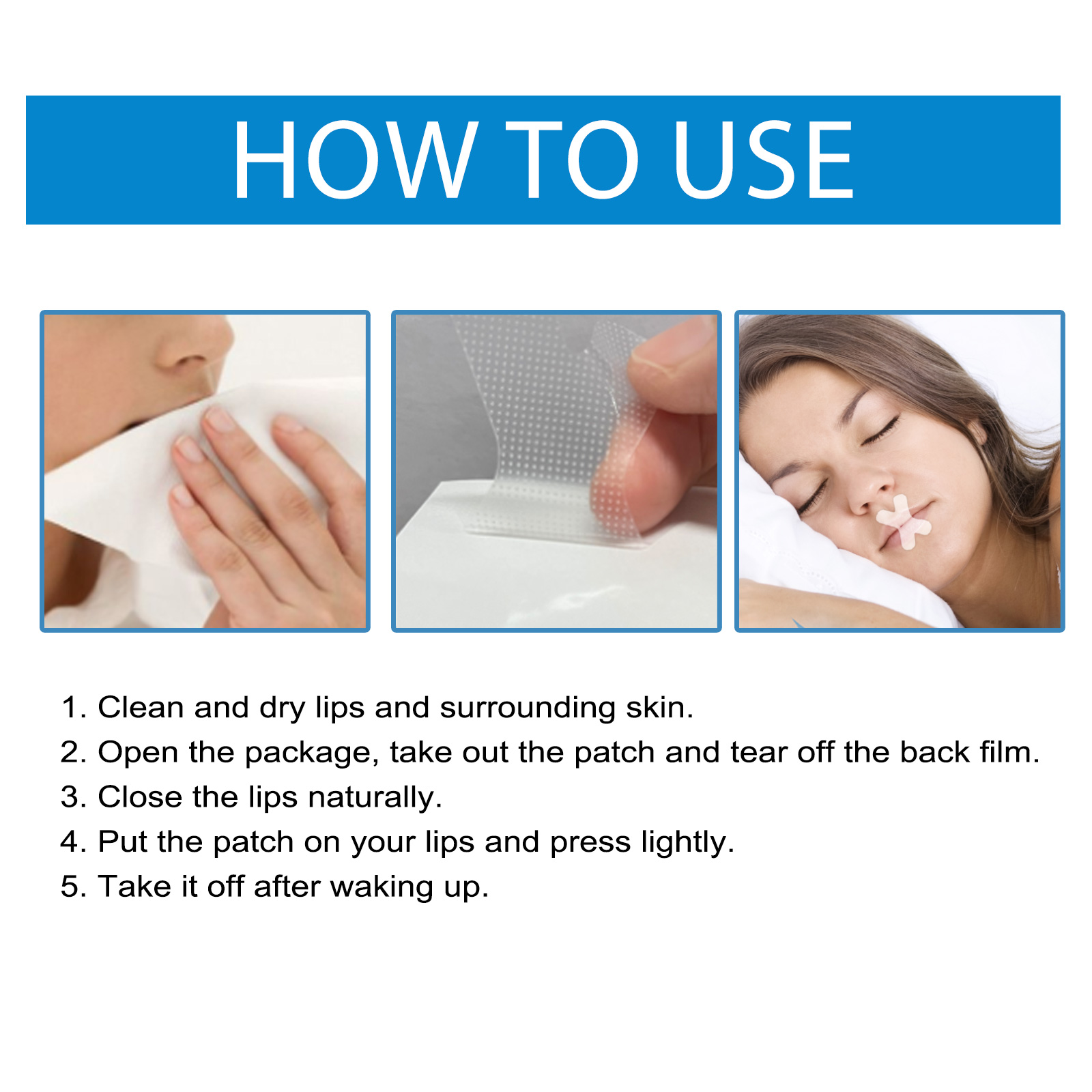 我们的打鼾舒缓口腔胶带含有天然合成橡胶。它可以有助于在睡觉时保持嘴巴紧闭,引导气流通过鼻子,帮助养成用鼻子呼吸的习惯鼻子,从而解决打鼾的问题, 改善因鼻塞引起的睡眠障碍。它的使用方法很简单:首先清洁干燥嘴唇和周围皮肤,然后打开包装,取出贴片,撕下背膜,之后自然闭上嘴唇,把贴片贴在嘴唇上,轻轻按压,最后在醒来后取下就可以了,使用之后有助于睡眠更加安稳,提升睡眠质量,让您和伴侣都度过一个安静舒适的夜晚。