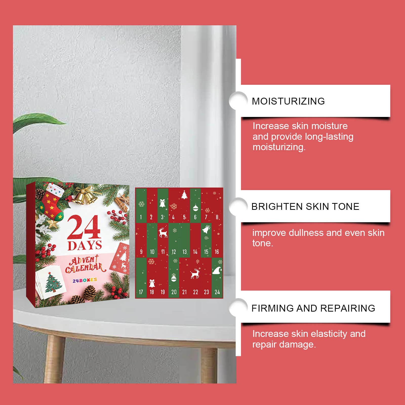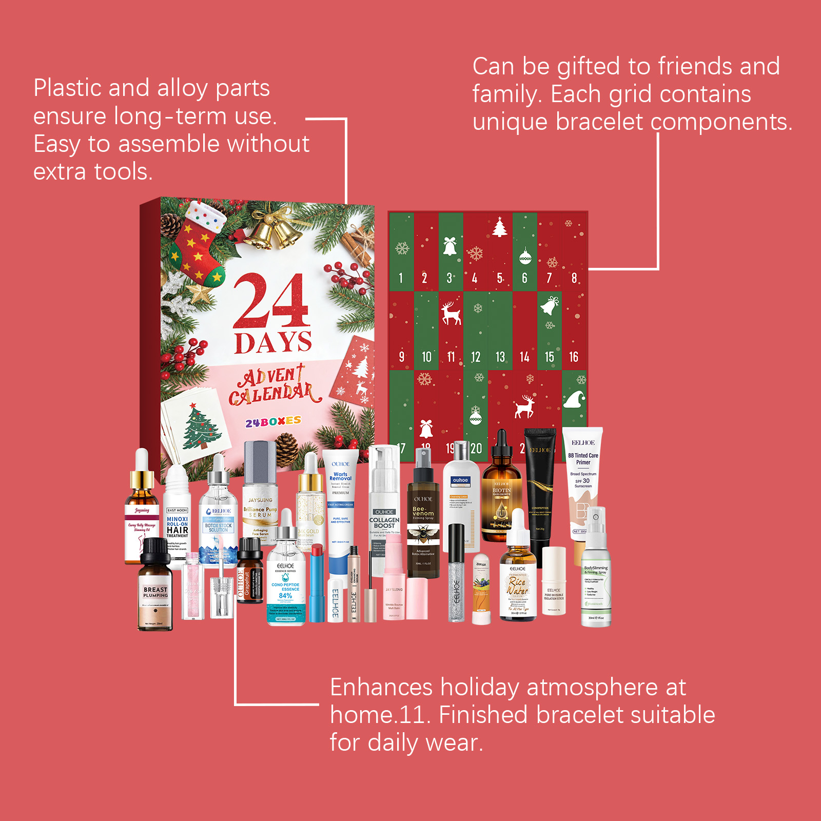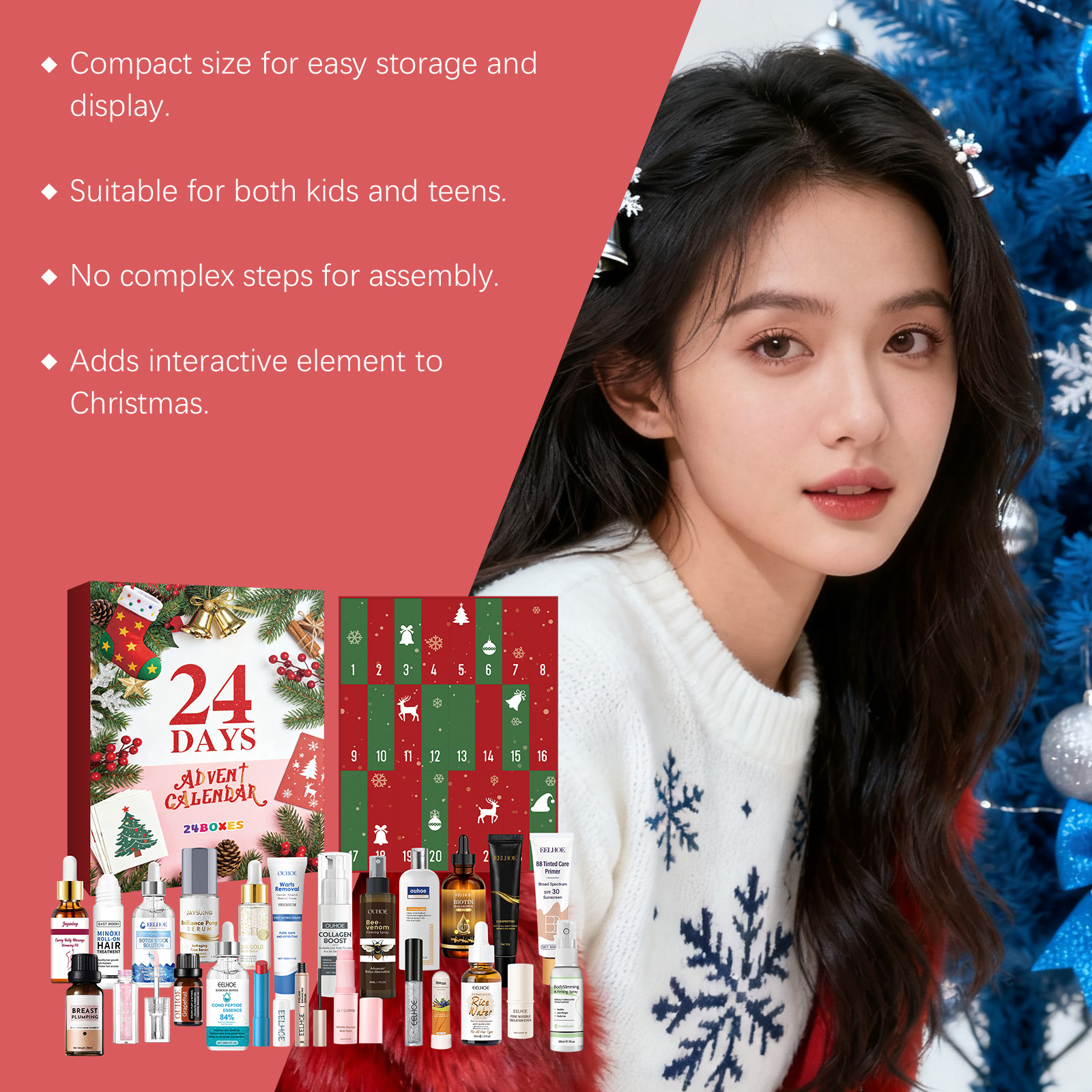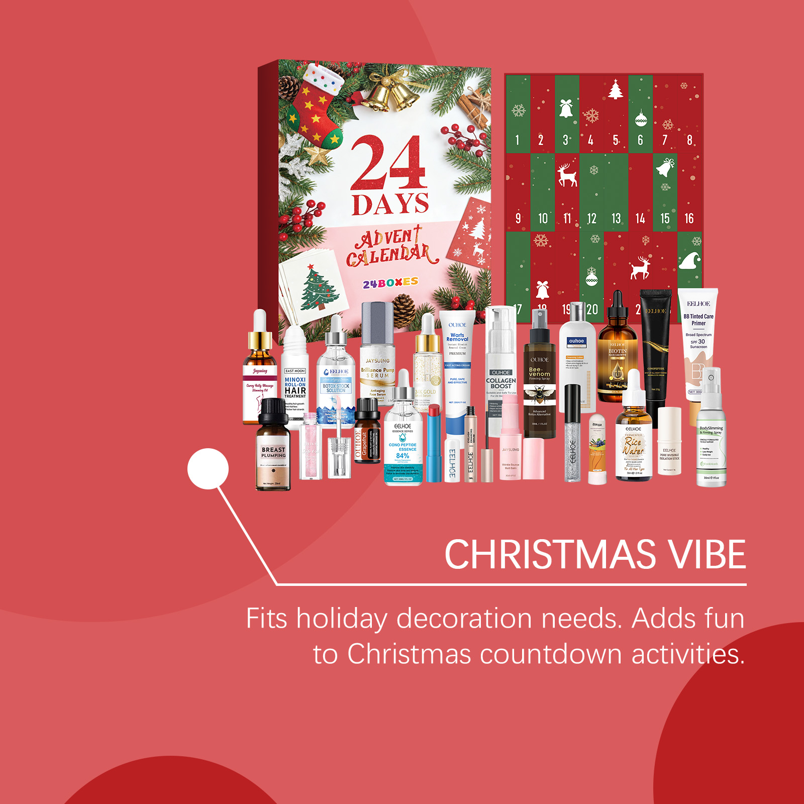 我们的圣诞节美妆盲盒,由身体护理精油、眼部紧致霜精心搭配而成。专为彩妆与护肤结合,轻松打造魅力设计。使用方法极为便捷:请参阅盒子内的说明以获取详细信息。并且它可以多种妆容组合,随心打造,保湿和滋润,滋润而不紧绷。