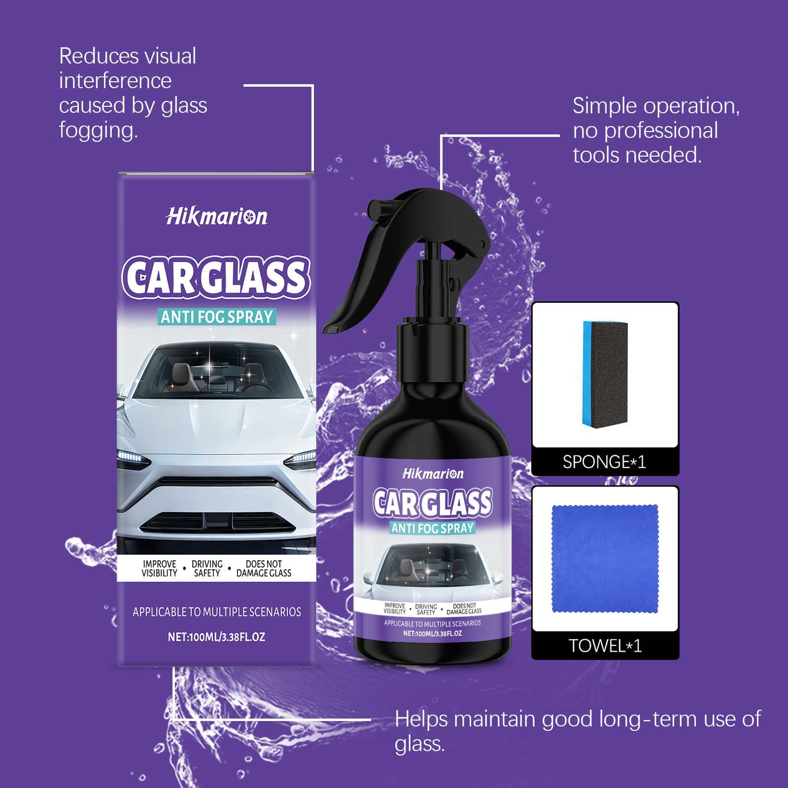 Hikmarion Car Anti-Fog Spray, Car Glass Rearview Mirror Cleaning, Defogging And Water Removal, Clear Vision In Rainy Days