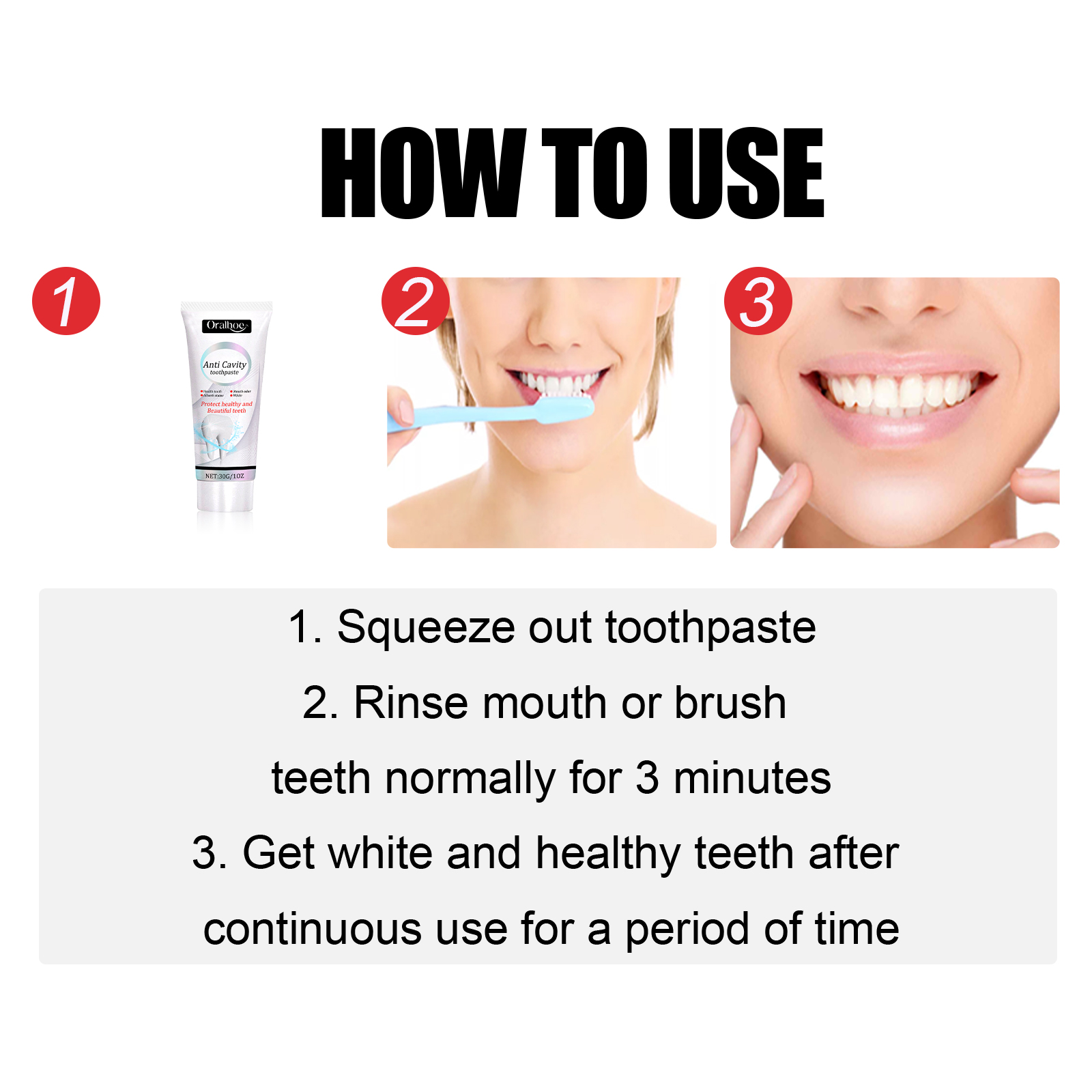 我们的牙齿洁白牙膏含有山梨醇聚甘油,碳酸氢钠,薄荷提取物。它可以帮助修复蛀牙,对抗蛀牙,让牙齿恢复健康,帮助去除口腔异味,清新口气,使你在交谈中更大方得体。它的使用方法很简单:挤出牙膏,正常漱口或刷牙3分钟,连续使用一段时间后,即可获得洁白健康的牙齿。可以美白牙齿,让您笑得更自信。