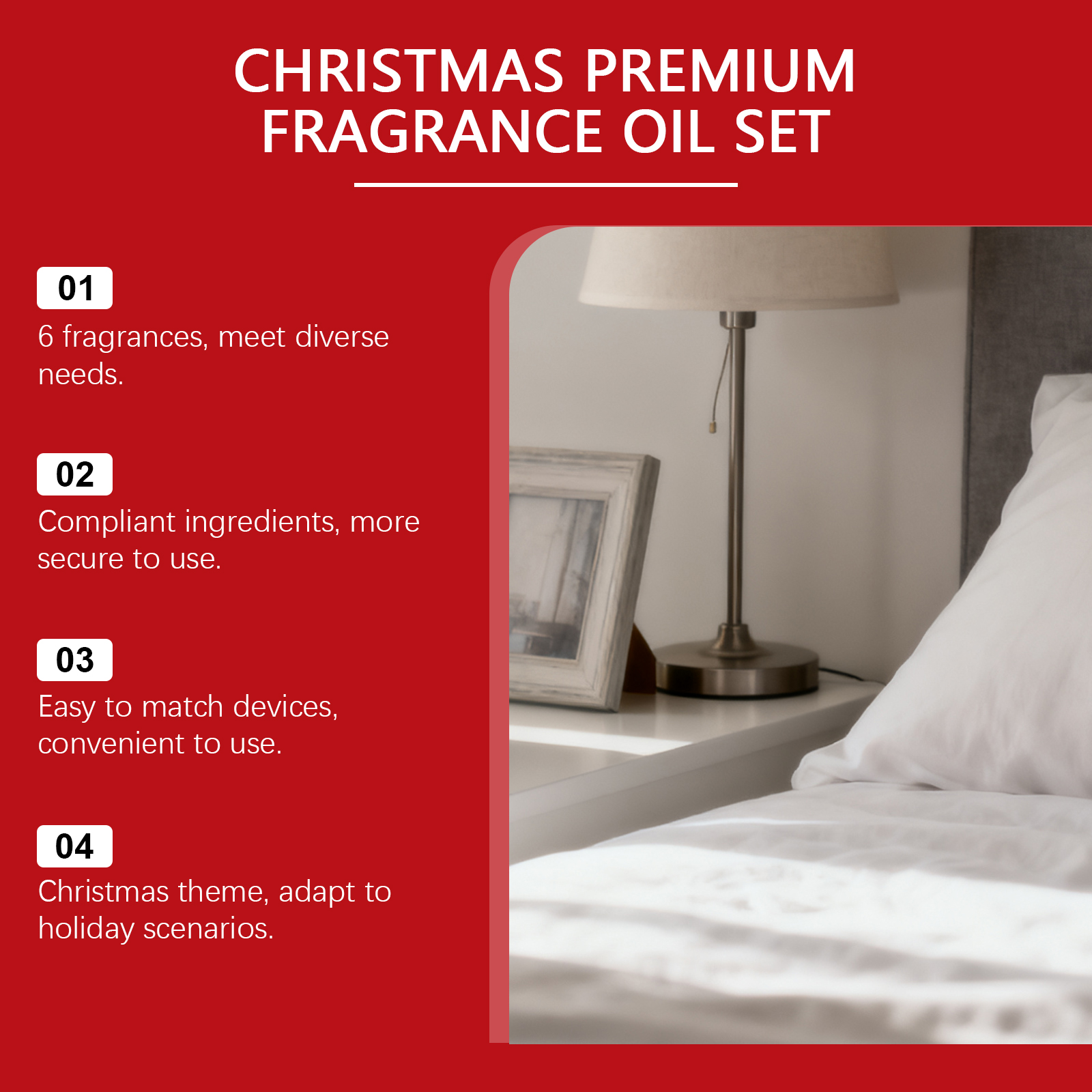 我们的圣诞香氛精油套装,由丙二醇、甘油精心调配而成。专为适应家庭、办公室及其他场景,帮助营造浓厚的圣诞氛围设计。使用方法极为便捷:只需将所需的精油香味滴入扩香器中。也可用于DIY项目,例如自制香薰蜡烛、房间喷雾等。并且它具有稳定的香味释放和持久的留香时间。