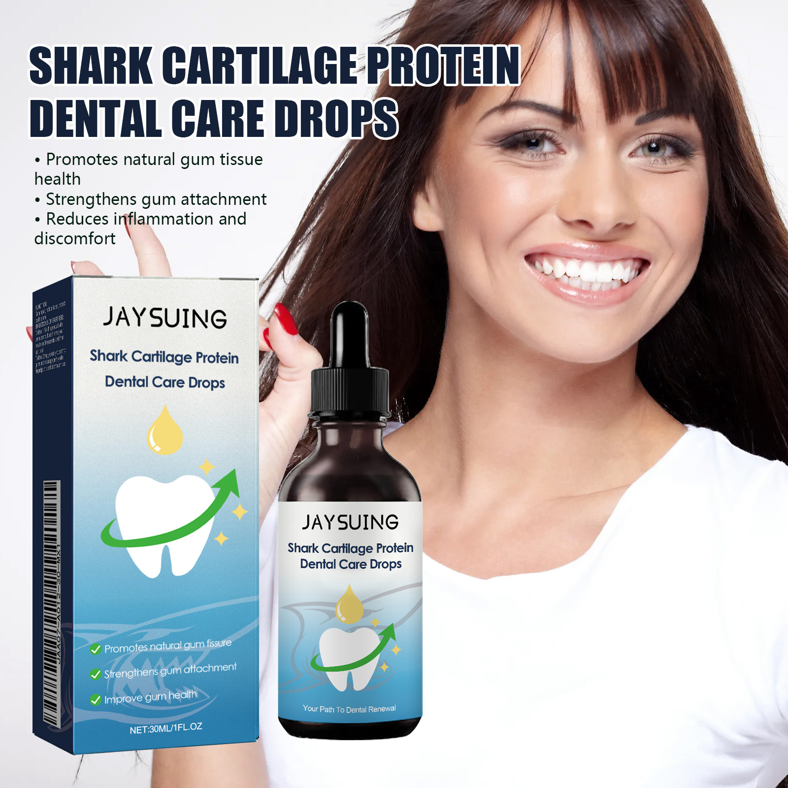 我们的牙齿护理滴剂含有鲨鱼软骨蛋白,木糖醇。它可以处理牙齿问题,呵护口腔口腔清洁。它的使用方法很简单:方法1:将本产品与水混合或漱口水,漱口30秒,然后吐出来;方法2:直接涂抹在牙齿或牙龈上,用指尖或软牙刷轻轻按摩。并且可以促进天然牙龈组织健康,加强牙龈附着力,减少炎症和不适。
