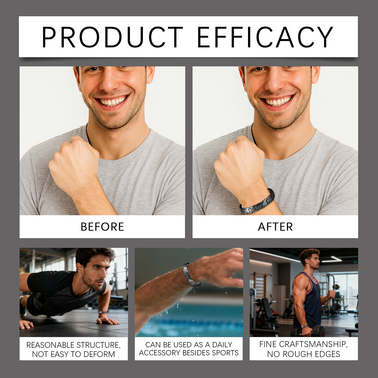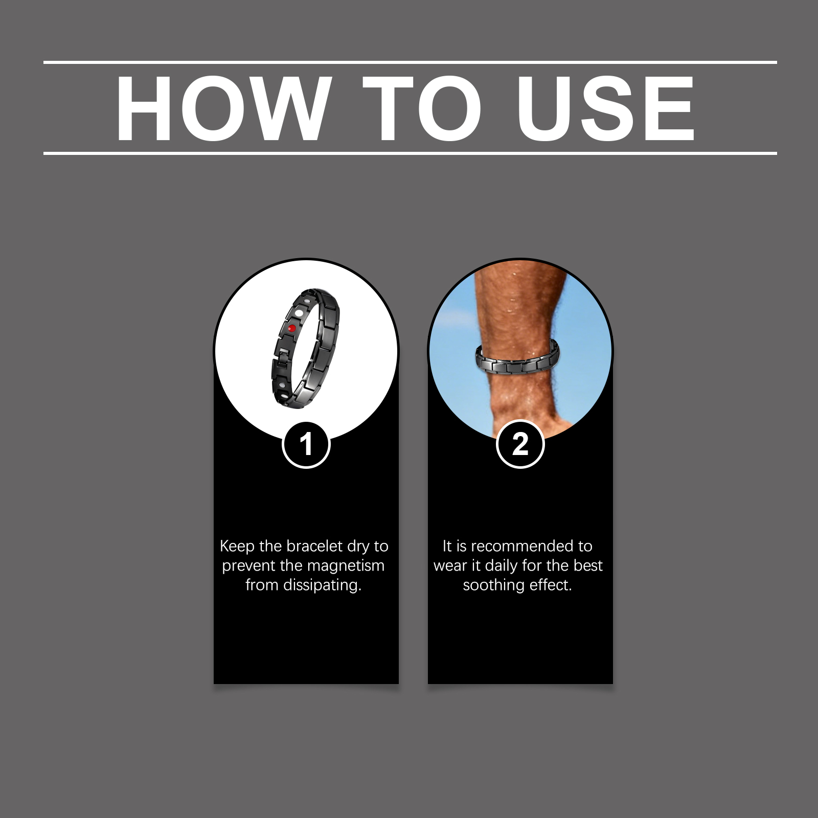 我们的运动手链,由锌合金、磁铁精心调配而成。专为适用于各种运动场景,适合大多数手腕尺寸设计。使用方法极为便捷:保持手链干燥,以防止磁性消散。建议每天佩戴以获得最佳舒缓效果。并且它简约设计,搭配任何服装都合适。