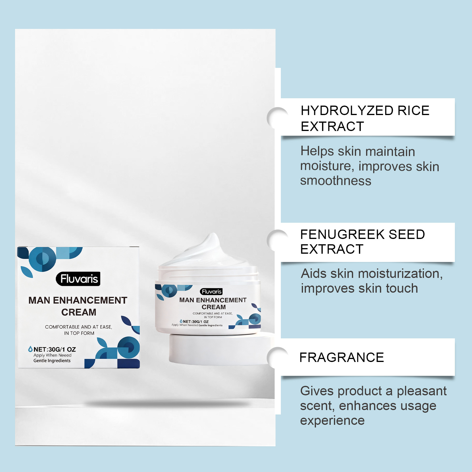 我们的男士护理霜,由胡芦巴籽提取物、水解大米提取物精心调配而成。专为满足亲密需求设计。使用方法极为便捷:1.清洁并擦干私密部位。2.将适量本产品均匀涂抹于私密部位。3.轻柔按摩,以促进吸收。并且可以及时获得结果。