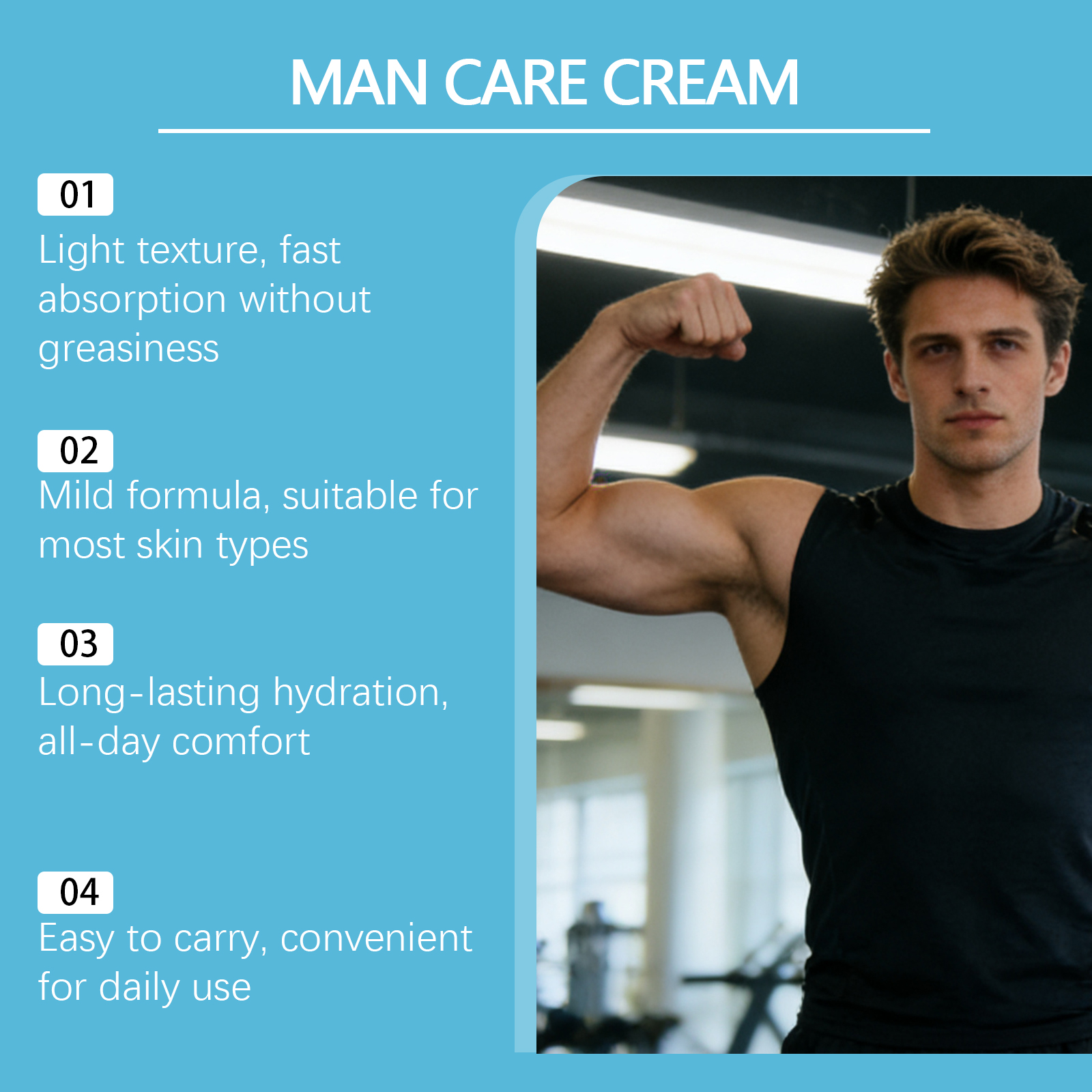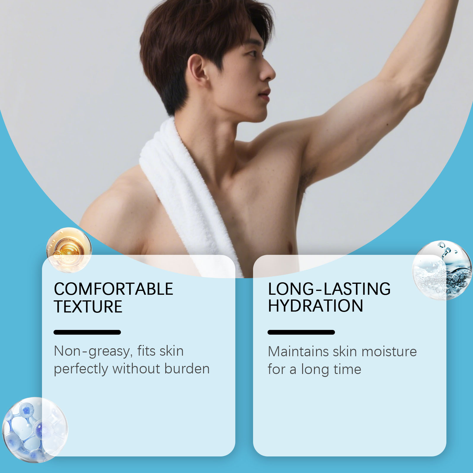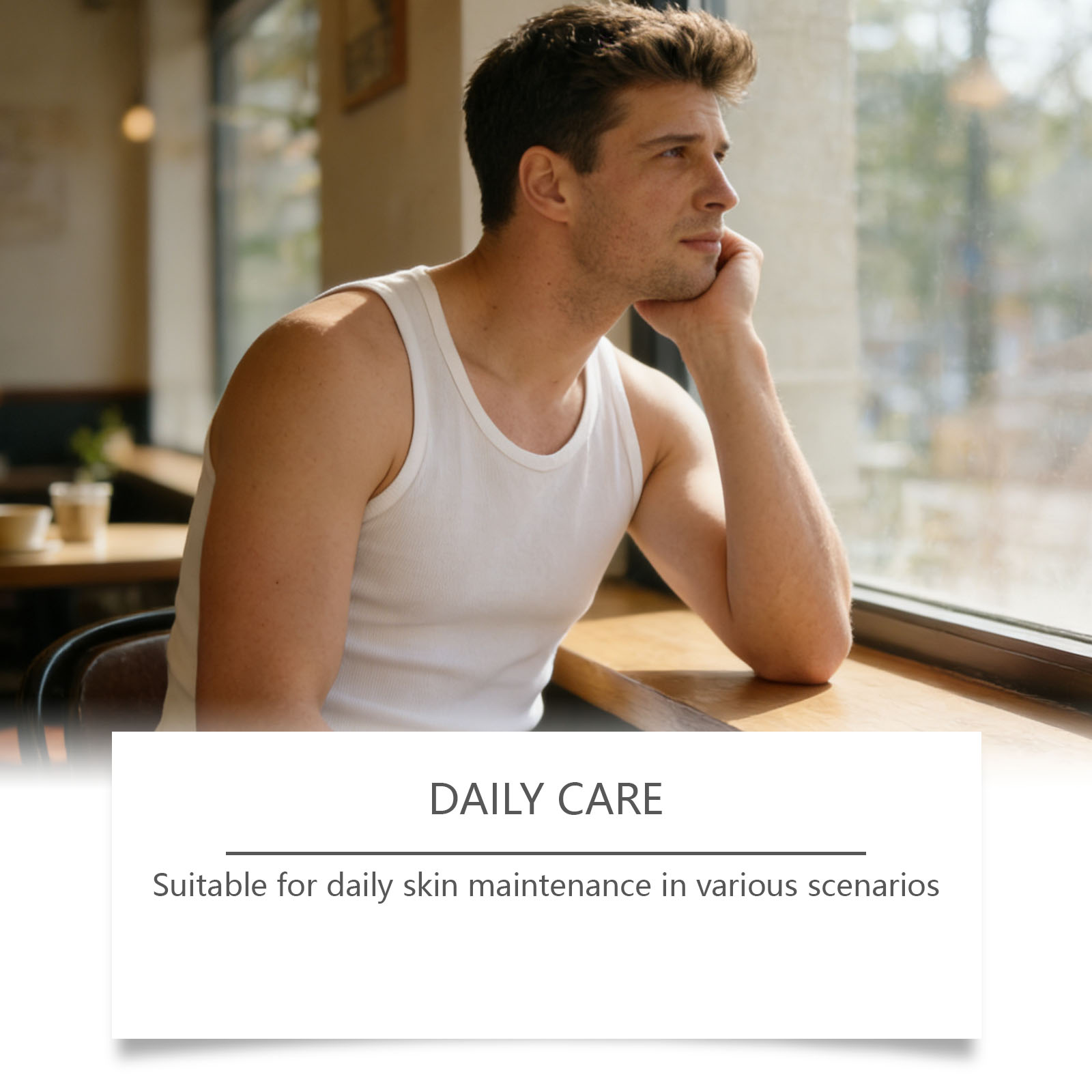 我们的男士护理乳霜,由卡波姆、精氨酸精心调配而成。专为提供水分并有效锁住水分设计。使用方法极为便捷:清洁并擦干皮肤。取适量本品均匀涂抹于全身,轻轻按摩直至完全吸收。并且可以形成保护膜,以减少水分流失。