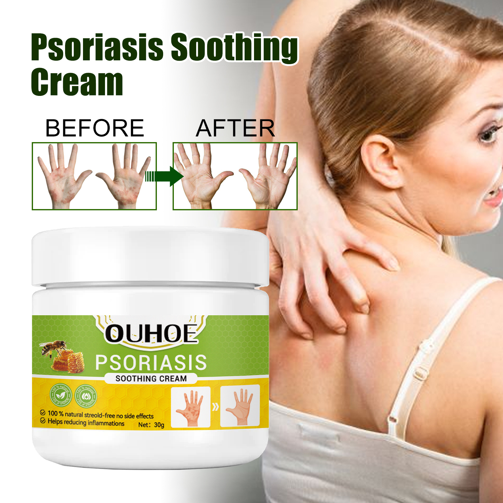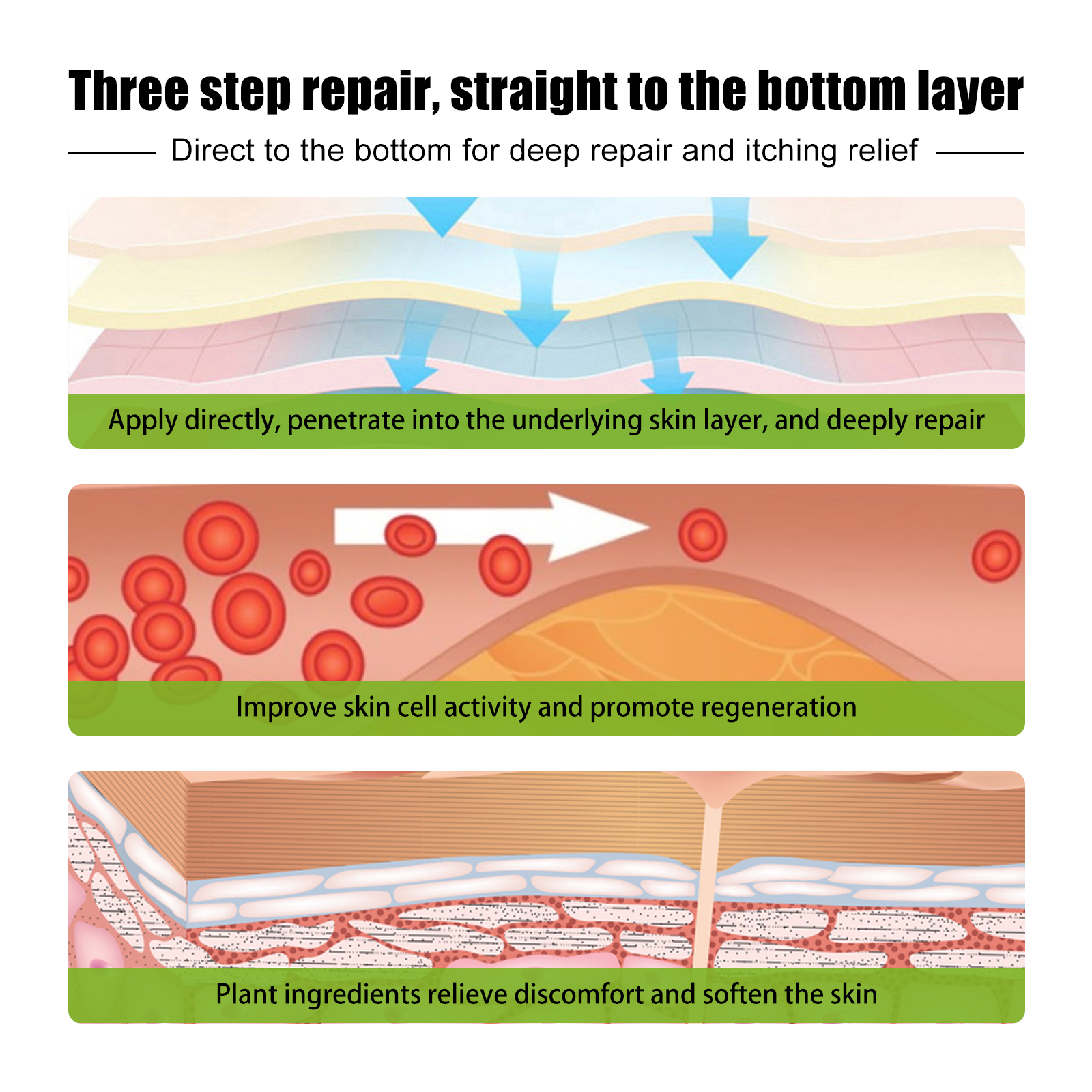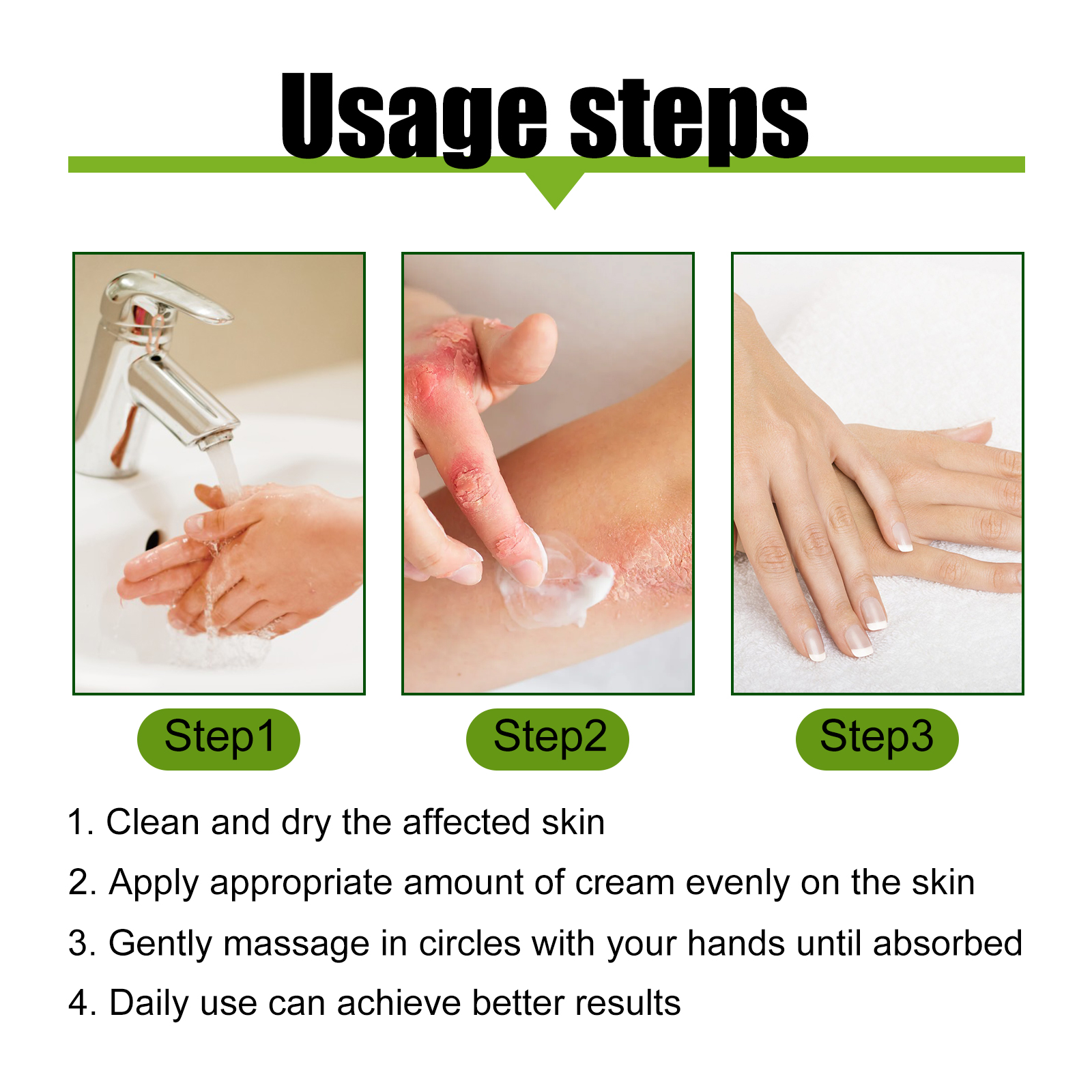 我们的牛皮藓修护霜含有蜂毒提取物、芦荟提取物、甘草根提取物。它可以缓解皮肤瘙痒,促进血液循环,天然成分消除银屑,涂抹在皮肤上起到消炎、止痒、促进皮肤修复的作用,为银屑病患者带来显著效果。它的使用方法很简单:首先清洁并擦干受影响的皮肤,取适量面霜均匀涂抹在皮肤上,之后用手轻轻打圈按摩,直至吸收,日常使用可以达到更好的效果,渗透至肌肤底层,深层修护,改善皮肤细胞活力,促进再生反馈植物成分缓解不适,软化皮肤。