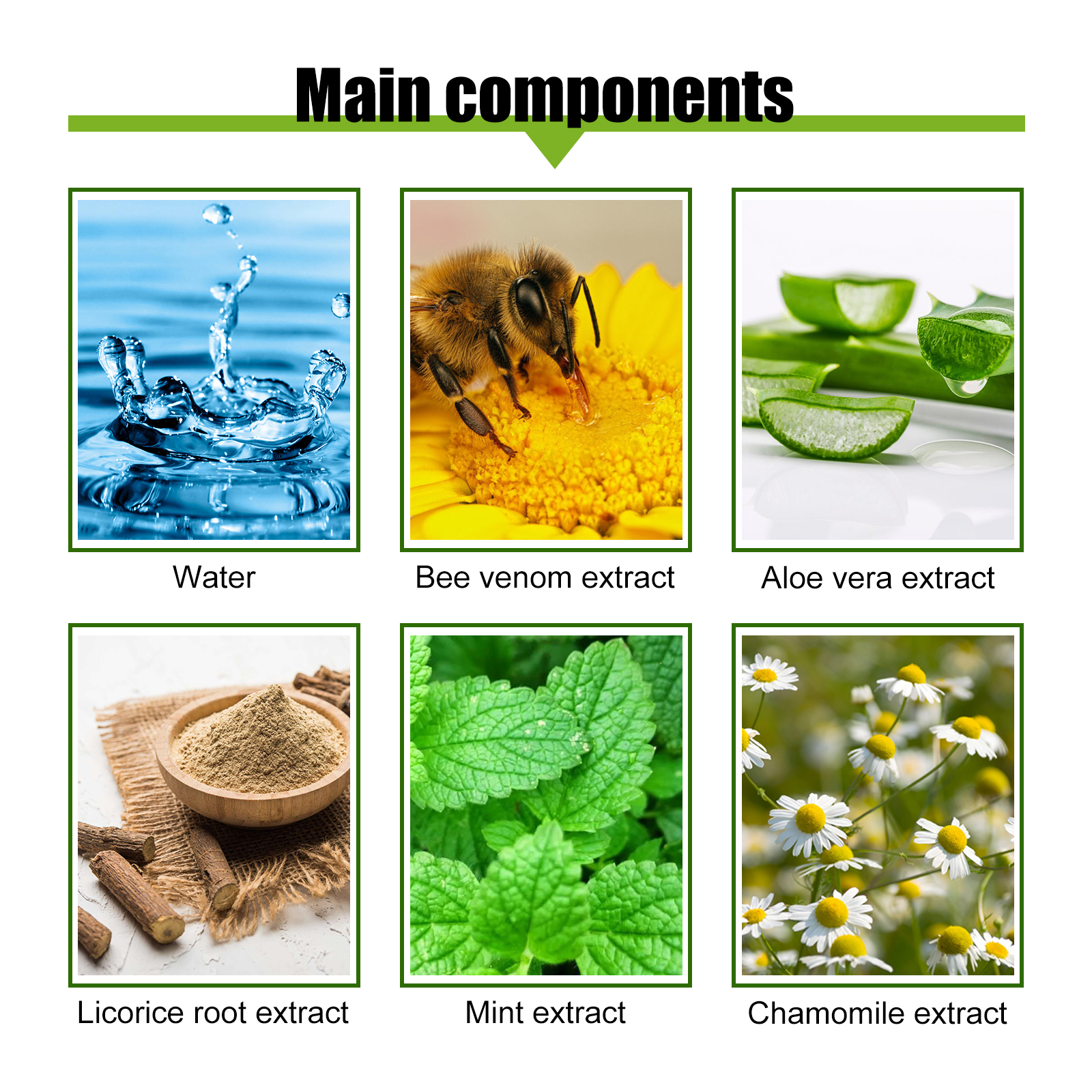| 成分 | 蜂毒提取物、芦荟提取物、甘草根提取物 |