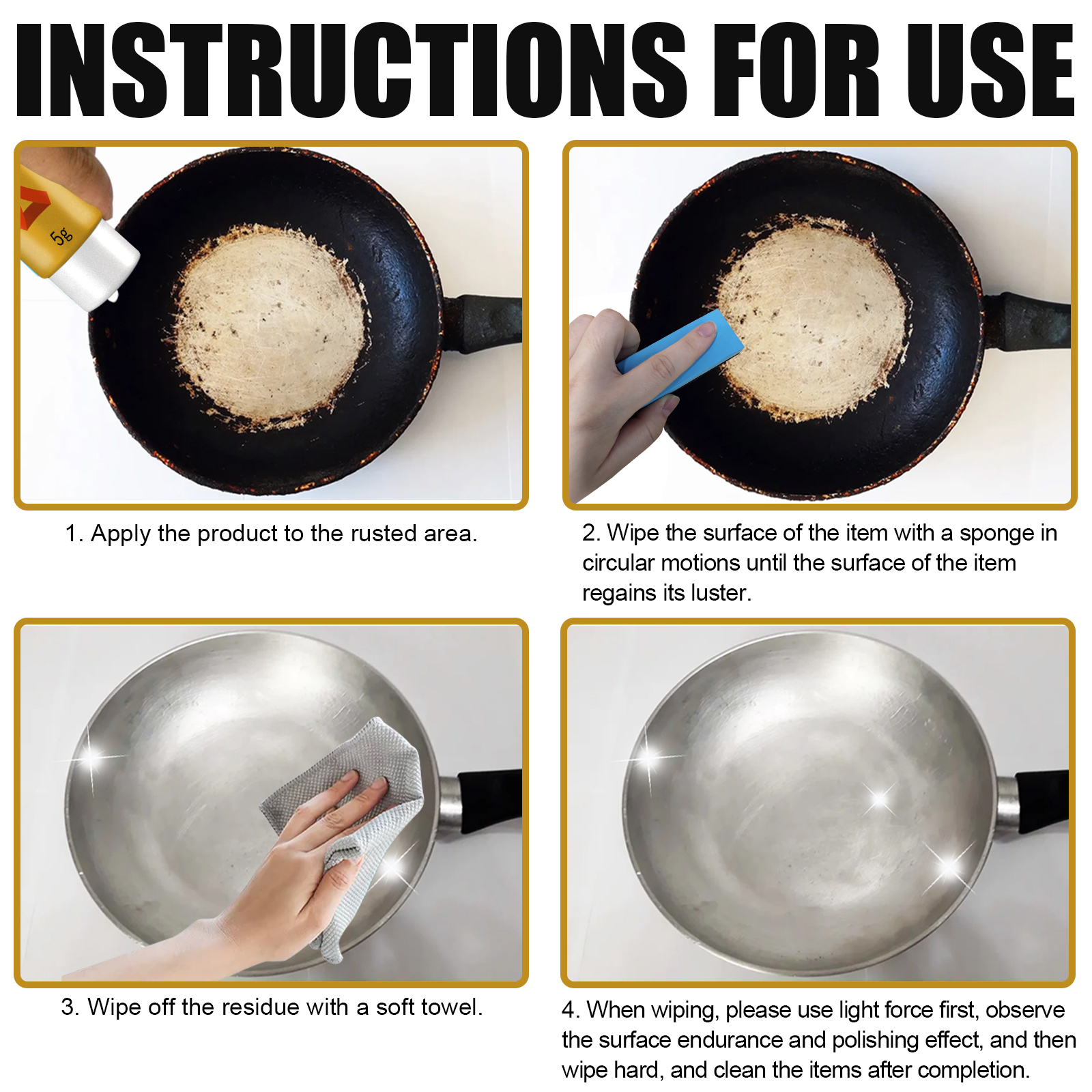 我们的金属擦亮膏含有金属膏。它可以快速清除各种金属表面的锈迹、污垢等氧化物。它的使用方法很简单:将本品涂抹在锈蚀部位,用海绵以圆周运动擦拭物品表面,直到物品表面恢复光泽,用软毛巾擦去残留物,擦拭时请先用轻用力,观察表面耐久度和抛光效果,再用力擦拭,完成后清洗物品。并且可以快速去除各种金属表面上顽固的锈渍。