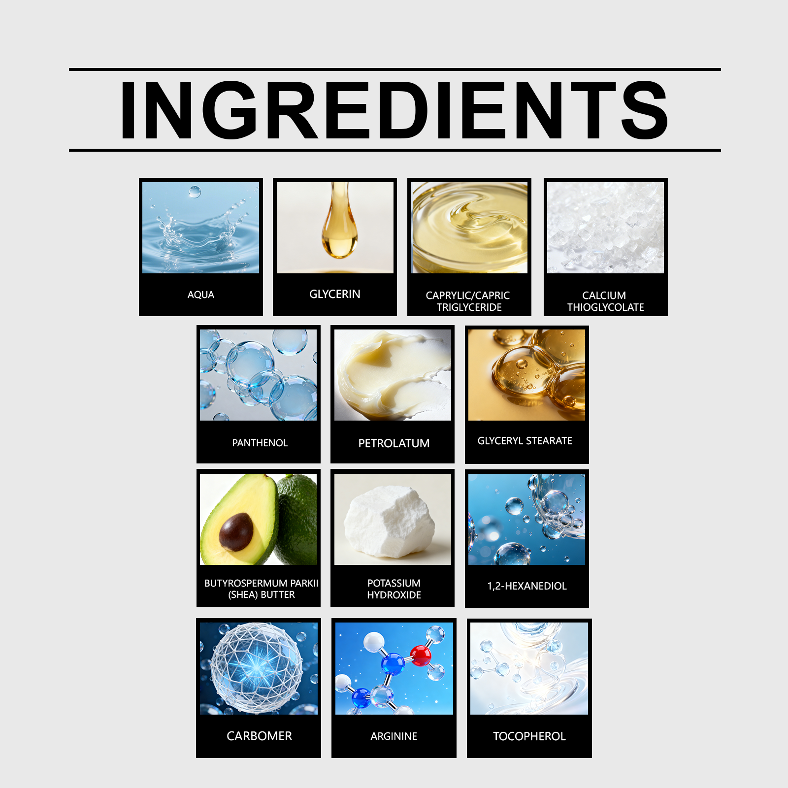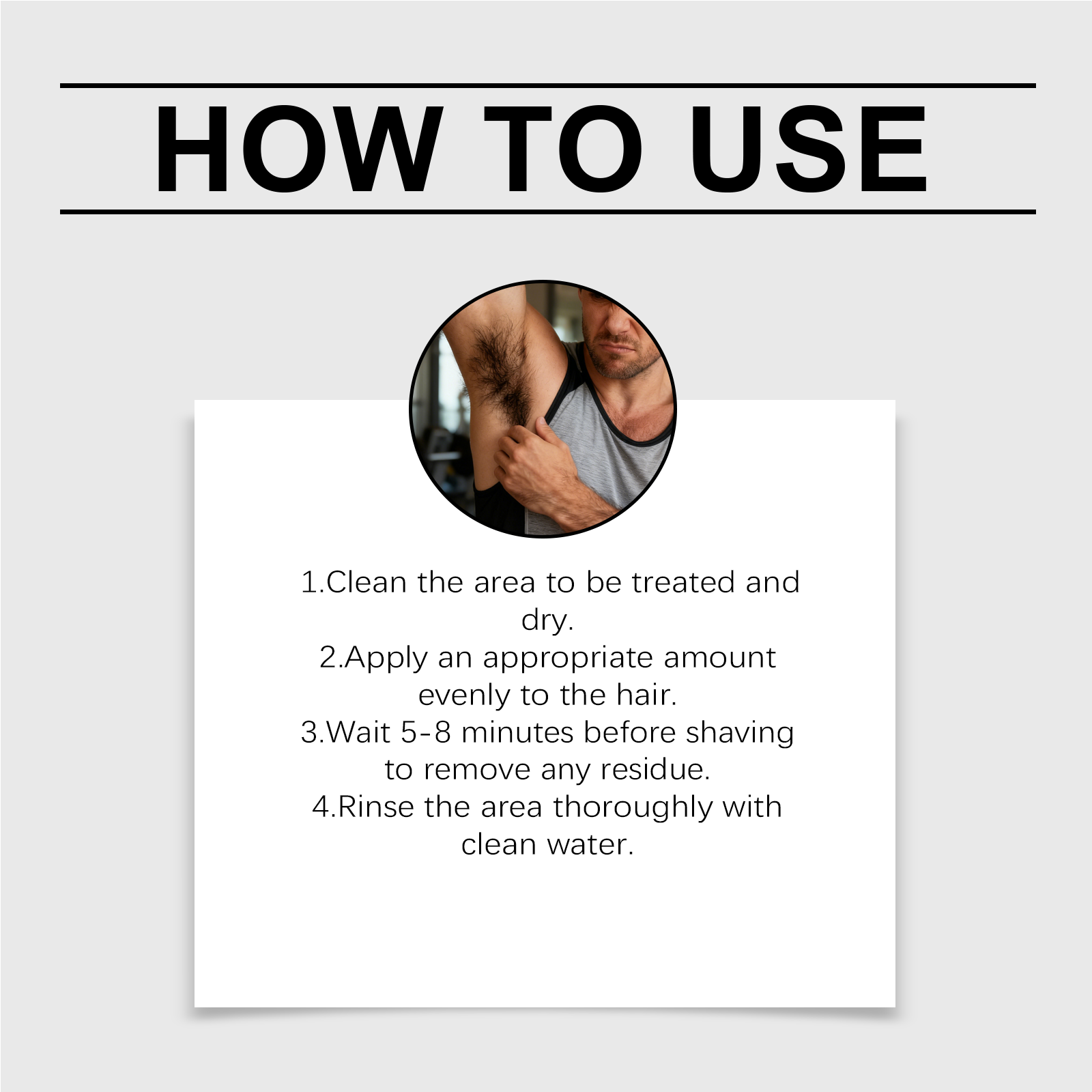 我们的男士身体脱毛膏,由卡波姆、精氨酸、生育酚(维生素 E)精心调配而成。专为舒缓并减轻不适设计。使用方法极为便捷:1.清洁待处理区域并擦干。2.将适量产品均匀涂抹于头发上。3.剃须前等待5-8分钟,以去除任何残留物。4.用清水彻底冲洗该区域。并且可以滋养角质层并减少干燥。