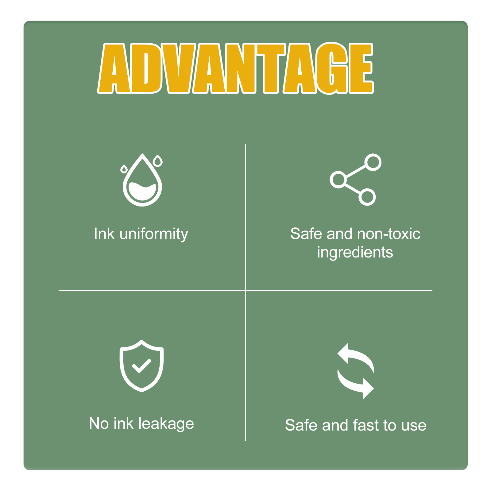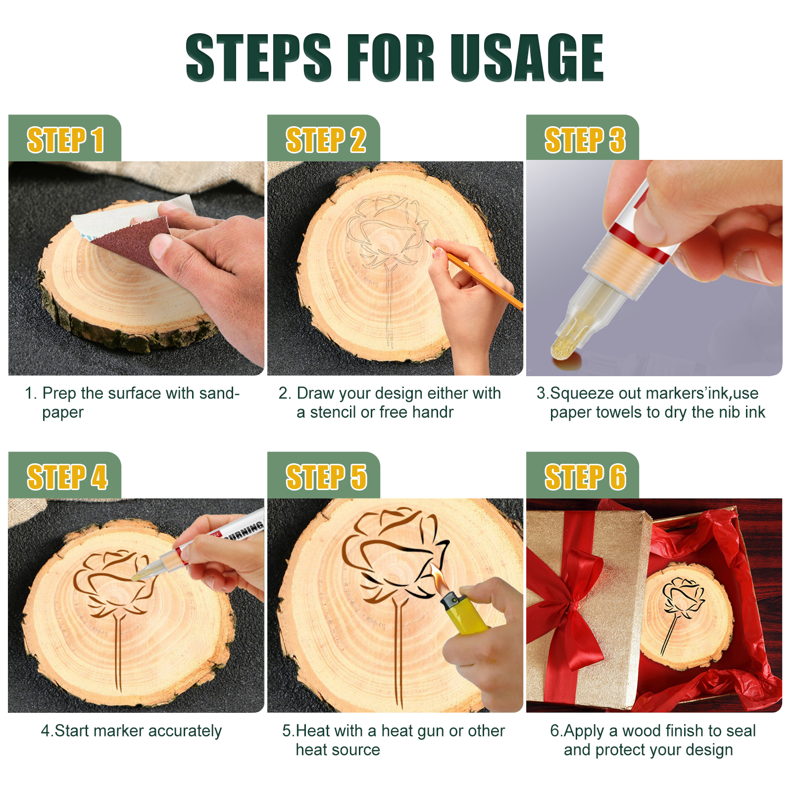 我们的木材燃烧笔套装含有亚麻子油、酒精。它可以使油墨均匀性,它的成分安全。它的使用方法很简单:1. 用砂纸准备表面;2. 用模板或自由手绘制您的设计;3.挤出记号笔的墨水,用纸巾擦干笔尖墨水;4.准确启动标记;5.用热风枪或其他热源加热;6.应用木饰面来密封和保护您的设计。并且可以在使用的过程中无漏墨,使用安全快捷等等。