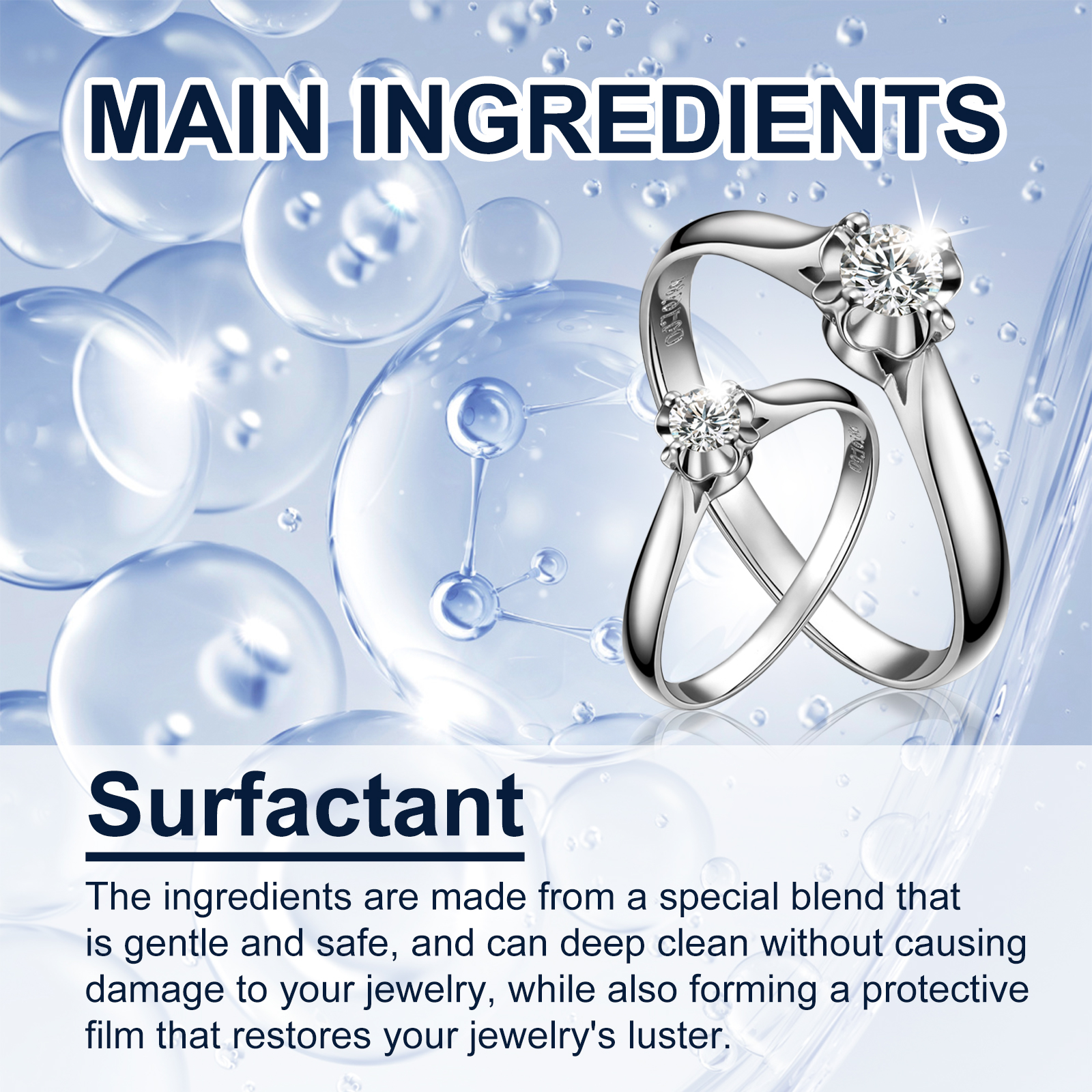 我们的珠宝清洁剂含有表面活性剂。它可以让金银珠宝变白,变干净,具有较强的清洁效果。它的使用方法很简单:1. 将清洁剂喷洒在珠宝上。 2.等待 1-2 分钟。 3.擦拭干净。并且可以深层清洁而不会损坏您的珠宝,同时还可以形成一层保护膜,恢复珠宝的光泽。