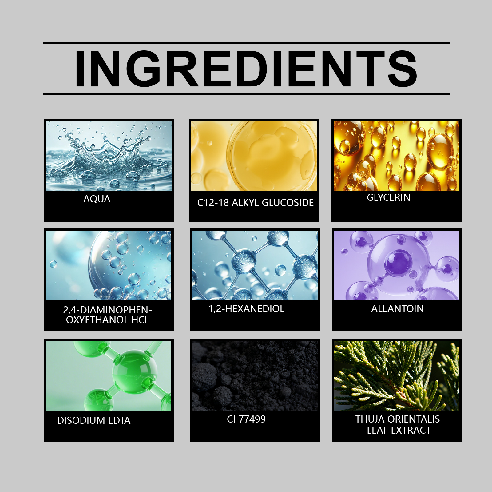 我们的黑色植物泡泡美发剂,由C12-18烷基葡糖苷、甘油精心调配而成。专为保持鲜艳的色泽,让头发柔软不卷曲设计。使用方法极为便捷:【染发前测试】使用前请务必进行皮肤敏感性测试。如果出现发红、肿胀、瘙痒或烧灼感等症状,请立即停止使用并洗掉残留的产品。【指示】1. 使用前确保头发干燥。2、操作时穿戴好防护用品,在面部、颈部、耳后、手臂等可能接触皮肤的部位涂抹面霜。3.将染发剂均匀涂抹在头发上,确保覆盖每一根发丝,等待30分钟让染料完全渗透头发。4. 用温水彻底冲洗头发,直至水流清澈。并且它可以精确均匀地隐藏白发。