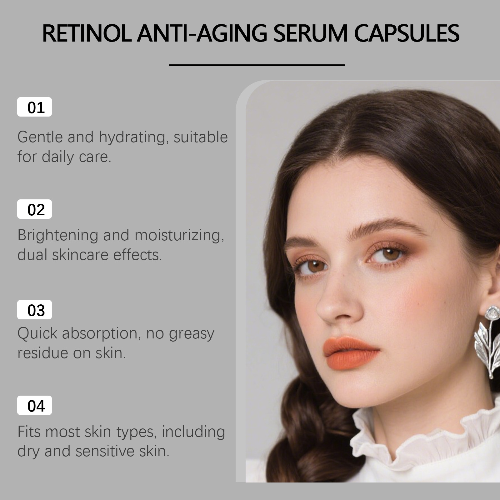 我们的视黄醇精华乳胶囊,由精氨酸、视黄醇精心调配而成。专为温和提升肌肤光泽设计。使用方法极为便捷:1.扭开胶囊,将内容物挤入掌心。2.均匀涂抹于面部,以打圈方式轻柔按摩至吸收。3.每晚洁面和爽肤后使用一粒胶囊。并且可以深层渗透,长时间锁住水分。