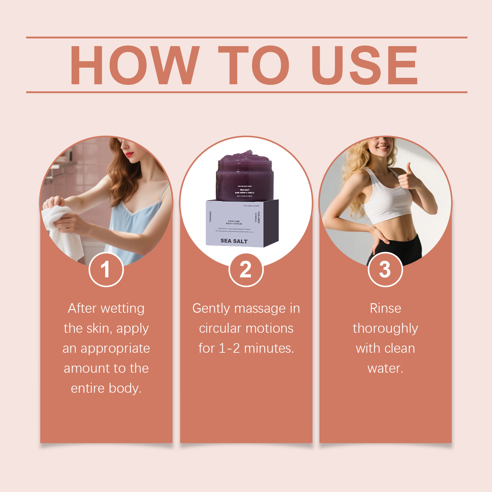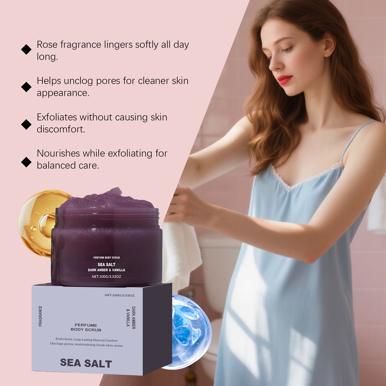 我们的琥珀香草香氛身体磨砂膏 ,由琥珀粉、灵香草提取物精心调配而成。专为温和减少粗糙感设计。使用方法极为便捷:湿润皮肤后,取适量涂抹于全身。以打圈方式轻柔按摩1-2分钟。用清水彻底冲洗。并且可以保持肌肤清新状态。