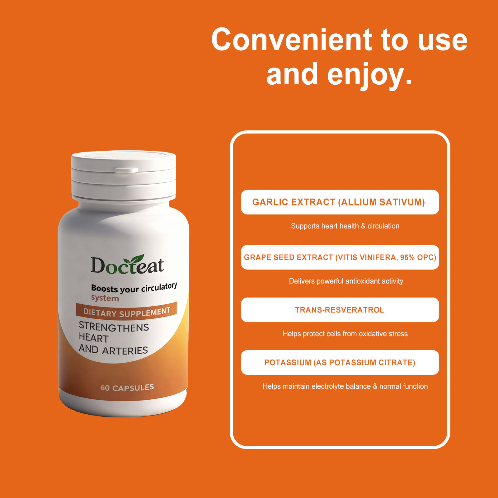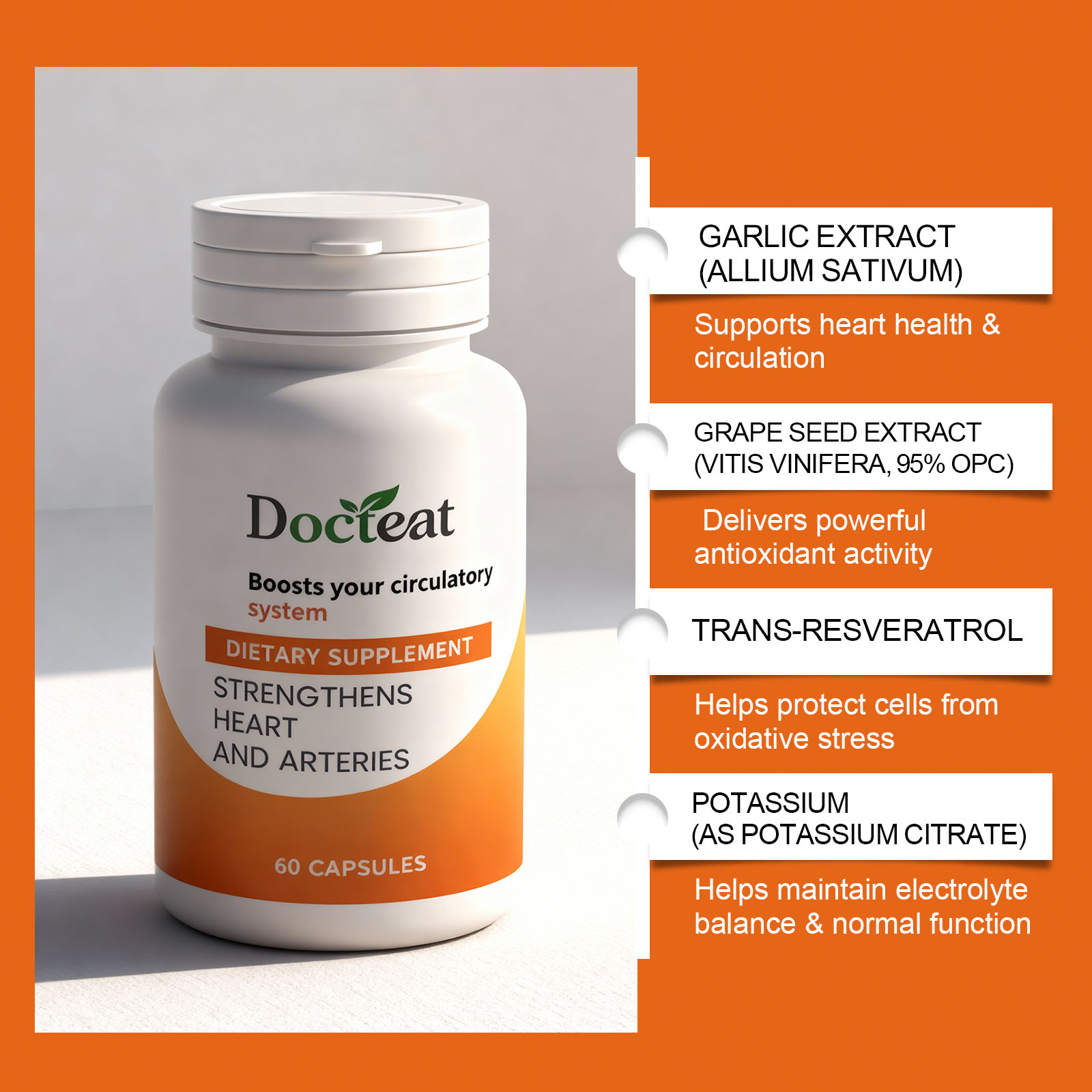 我们的营养支持胶囊,由大蒜提取物、葡萄籽提取物精心调配而成。专为支持心脏健康功能和血液流动,提供强大的抗氧化保护设计。使用方法极为便捷:每天一次,每次2粒。并且它可以有助于保护细胞免受应激因素的影响。