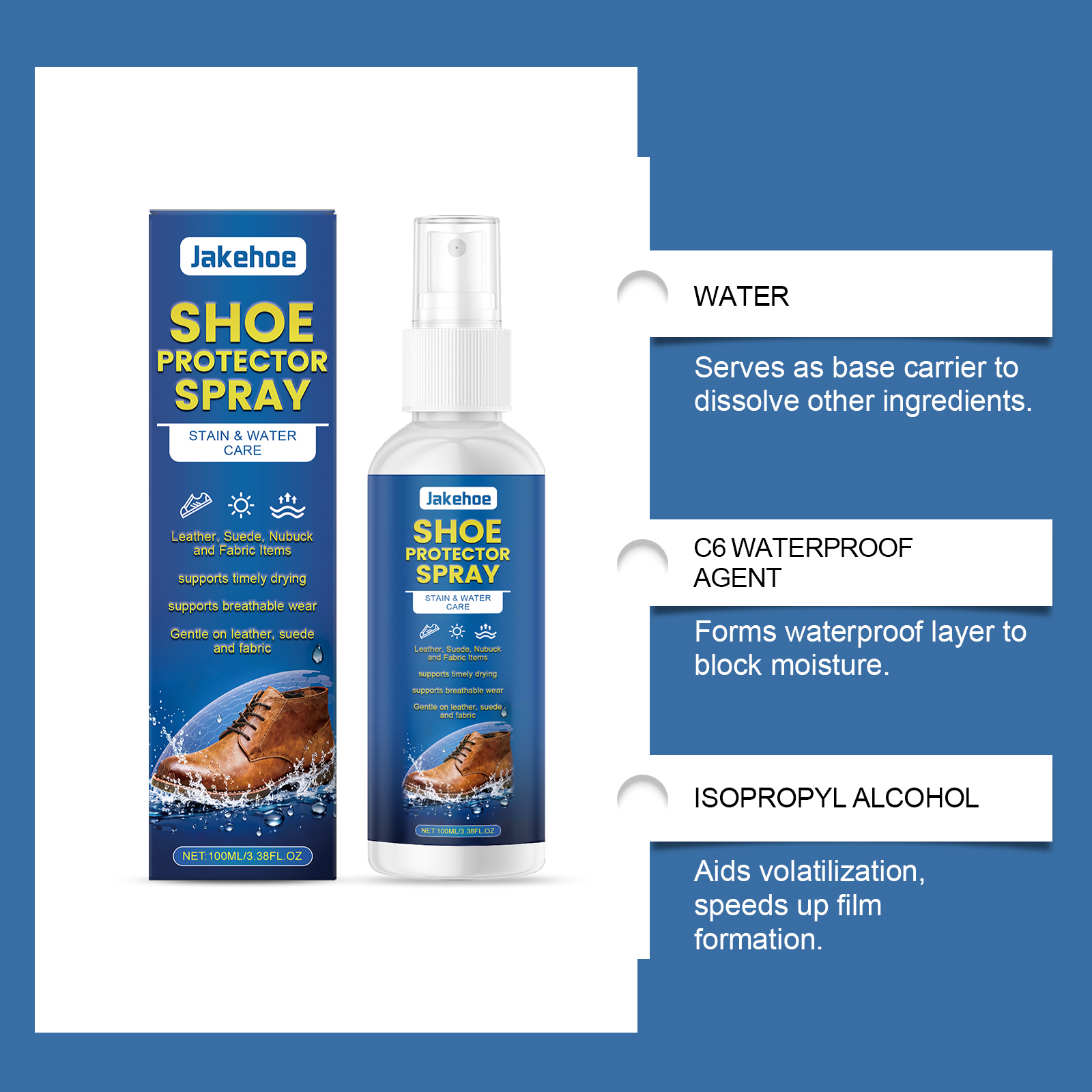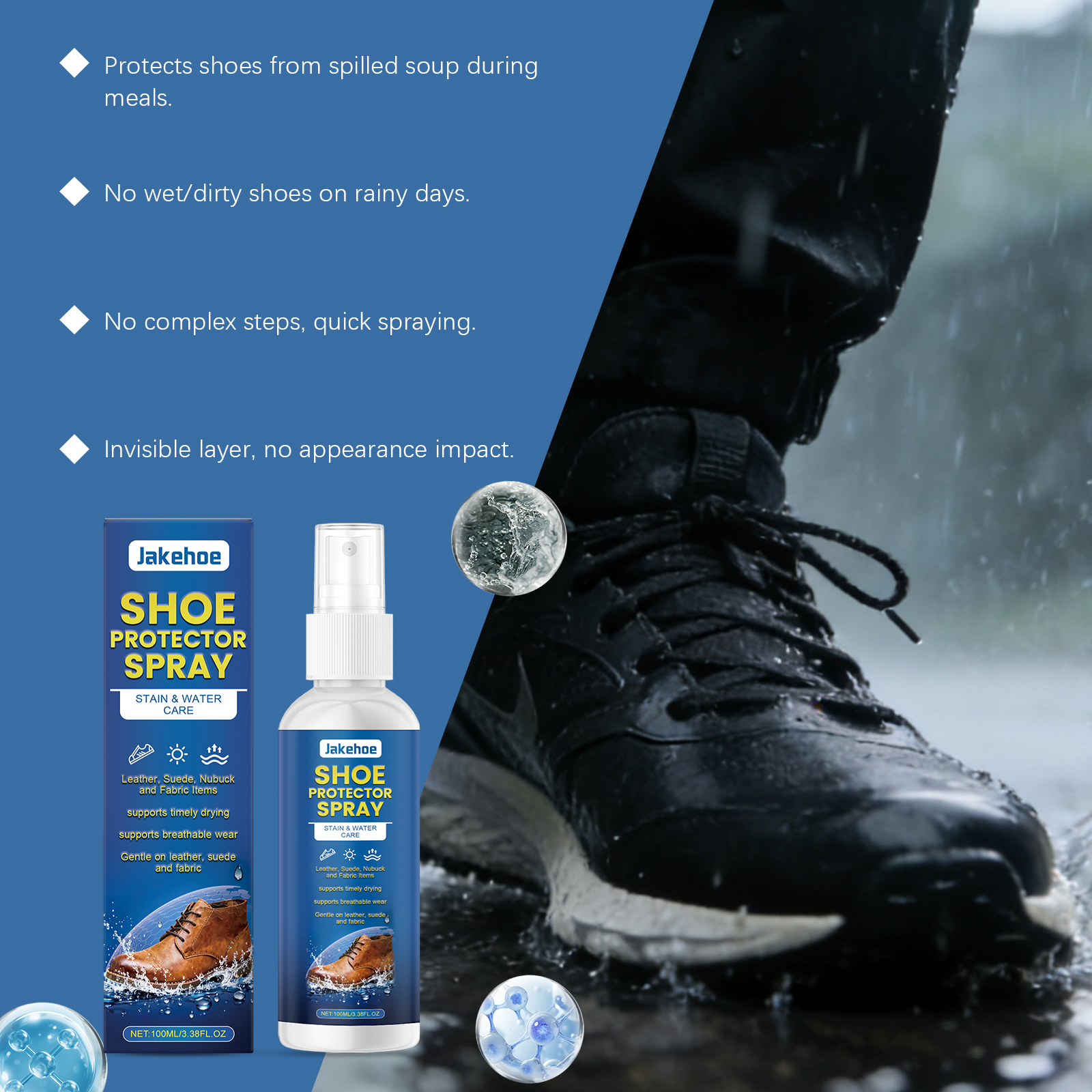 我们的鞋履护理喷雾,由脂肪醇聚氧乙烯醚, 1,2-己二醇精心调配而成。专为有效阻挡雨水设计。使用方法极为便捷:使用前,请充分摇匀,并确保鞋子干净干燥。将产品均匀喷洒在鞋面上,距离为15厘米,并静置干燥10分钟。再次均匀喷洒,并静置干燥30分钟。并且可以减少污渍,可用水清洗。