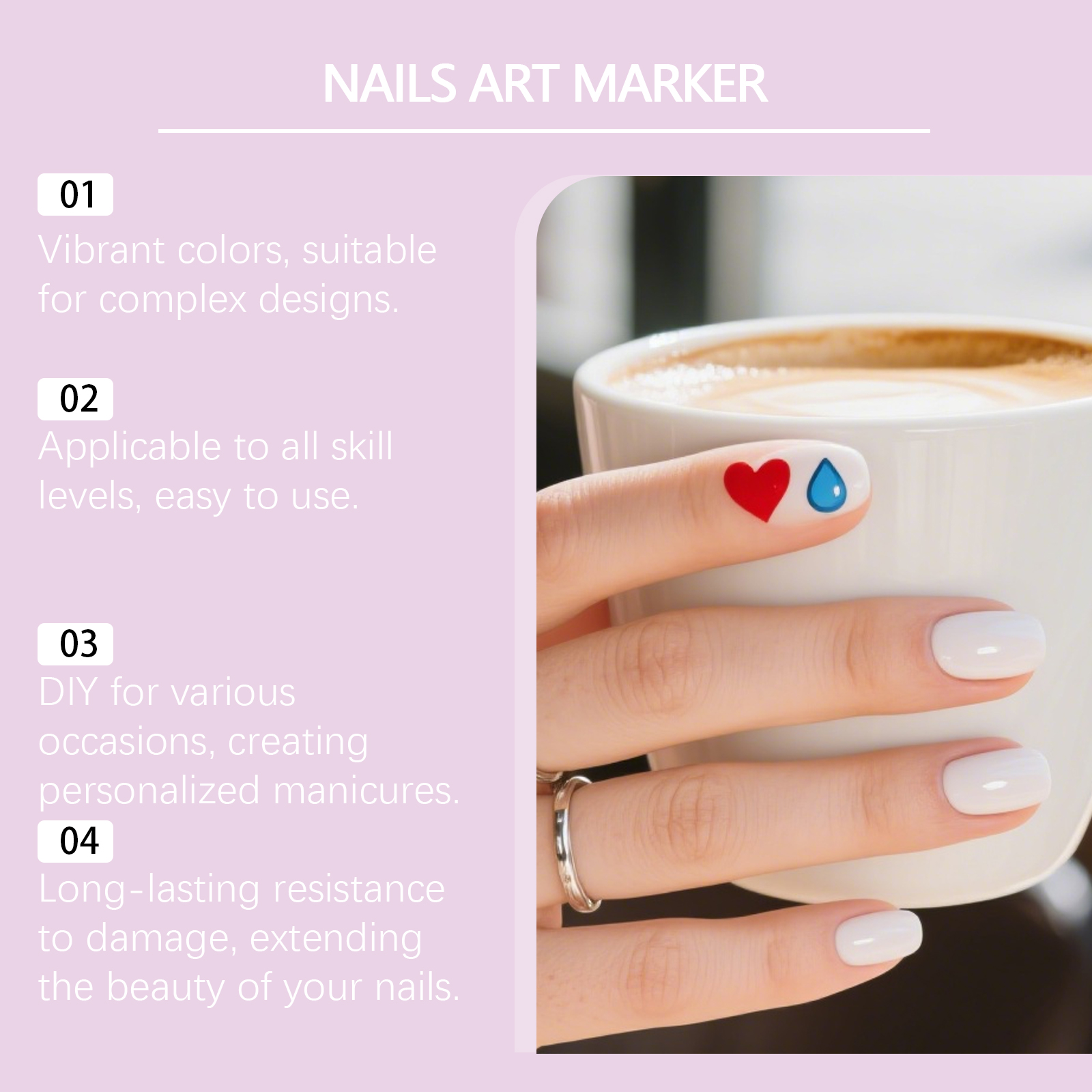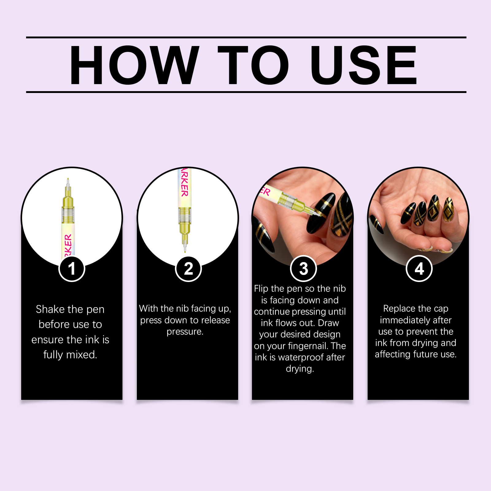 我们的美甲涂鸦笔,由氟碳树脂、膨润土精心调配而成。专为在家创作,包括花卉和抽象图案,无需专业沙龙服务设计。使用方法极为便捷:使用前摇晃笔身,确保墨水充分混合。笔尖朝上,按压以释放压力。将笔翻转,使笔尖朝下,并持续按压直至墨水流出。在指甲上绘制你想要的图案。墨水干燥后具有防水性。使用后立即盖上笔帽,以防墨水干涸影响后续使用。并且它具有丰富鲜艳的色彩,适合时尚美甲和精细装饰。