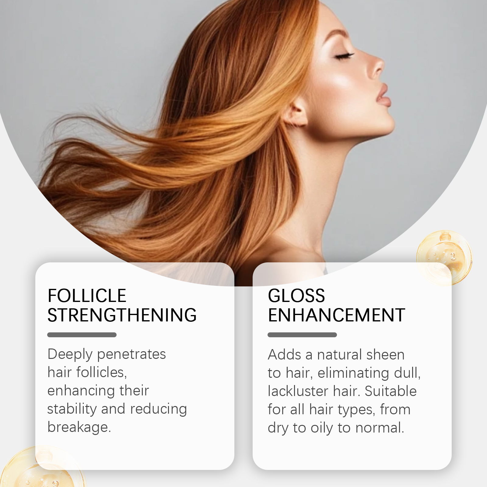 我们的保湿护发精油,由精氨酸、迷迭香提取物精心调配而成。专为深入渗透毛囊,增强其稳定性并减少断裂设计。使用方法极为便捷:1.清洁并吹干头发。2.将2-3滴精油均匀涂抹于头发上。3.轻柔按摩至吸收。并且可以为头发增添自然光泽,消除暗哑无光的发质。适用于所有发质类型,从干性到油性和正常发质皆宜。