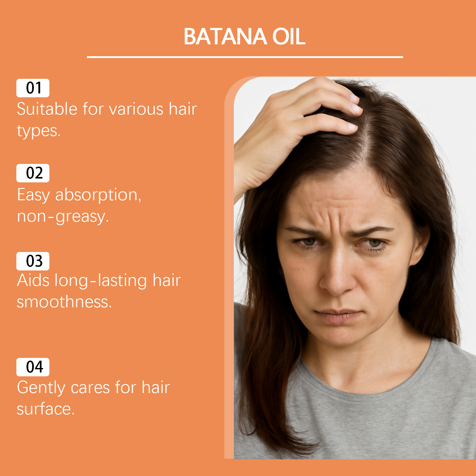 我们的巴塔纳护发油,由迷迭香提取物、蓖麻籽油精心调配而成。专为保持头发湿润,防止干燥设计。使用方法极为便捷:清洁头皮和头发并擦干。取适量巴塔纳油于掌心。轻轻按摩头皮和头发直到完全吸收。无需冲洗。并且有助于使头发质地更顺滑。
